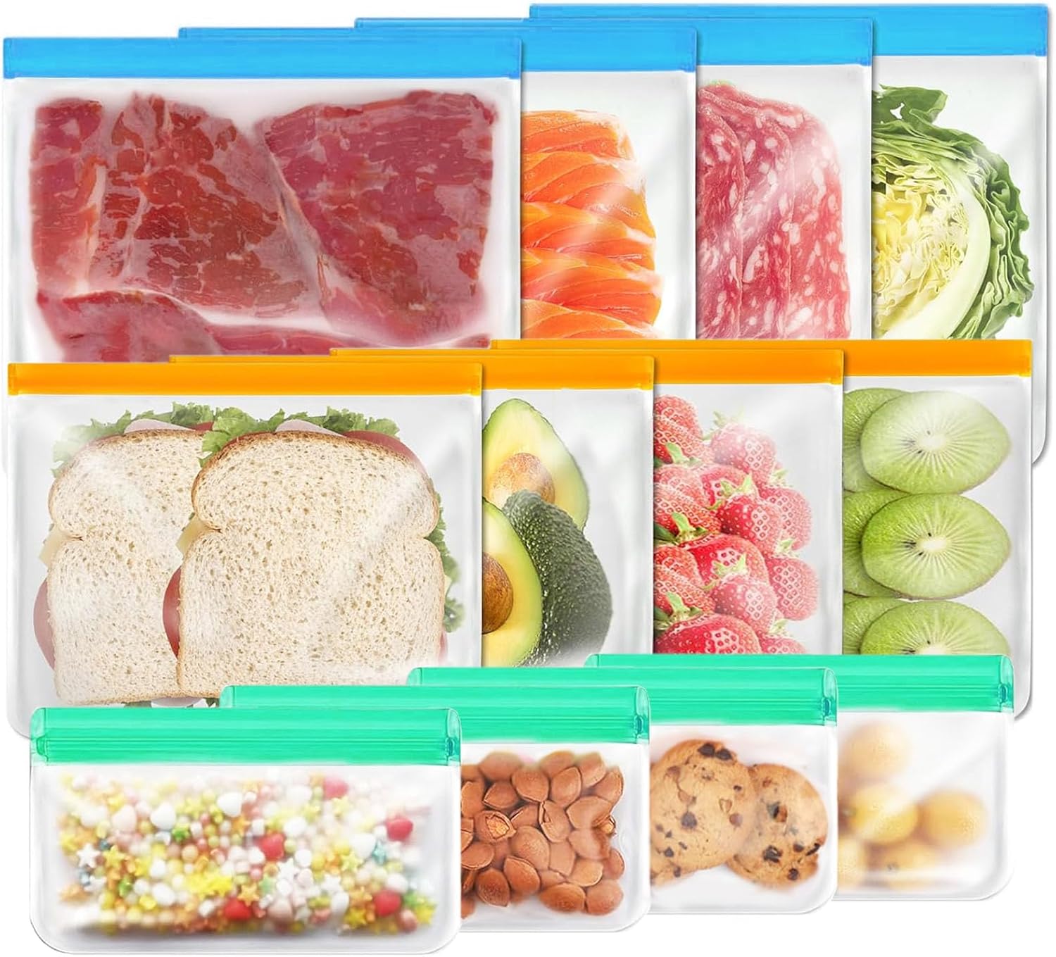 12 Pack Reusable Food Storage Bags Dishwasher Safe, Silicone Extra Thick Leak-proof Reusable Freezer Bags for Candy, Snack, Cereal, Travel Items, Home Organization