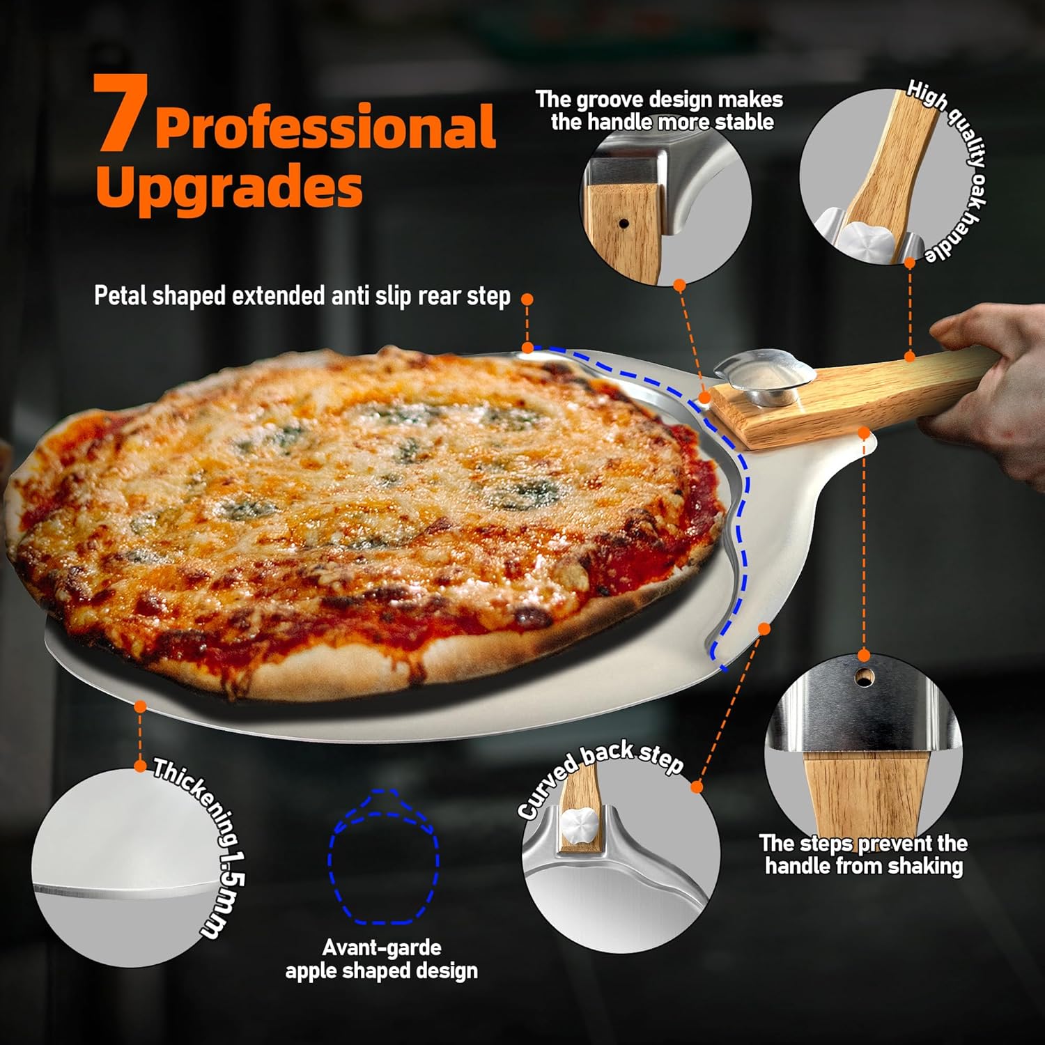 - 【Durable and easy to use】: With a metal pizza peel thickened to 1.5mm, even your heaviest pizza won't bend. The anodized pizza paddles have a smoother and more corrosion-resistant surface, allowing the dough to slide more easily. The high-end oak handle provides a comfortable grip while also making it more durable and sturdy.