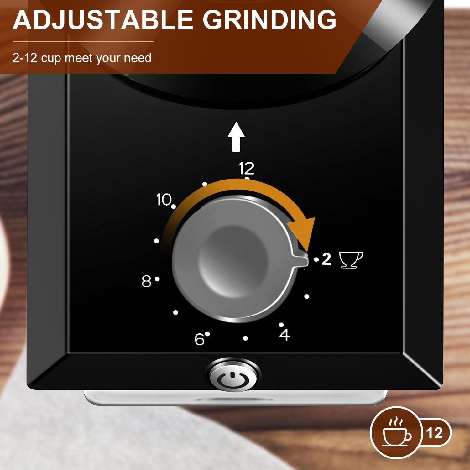 - ăCustomizable for 2-12 CupsăThis coffee grinder has an on-demand grinding function. According to the amount of coffee grinding you choose, from 2-12 cups, automatically grind the exact amount of coffee grounds for you.