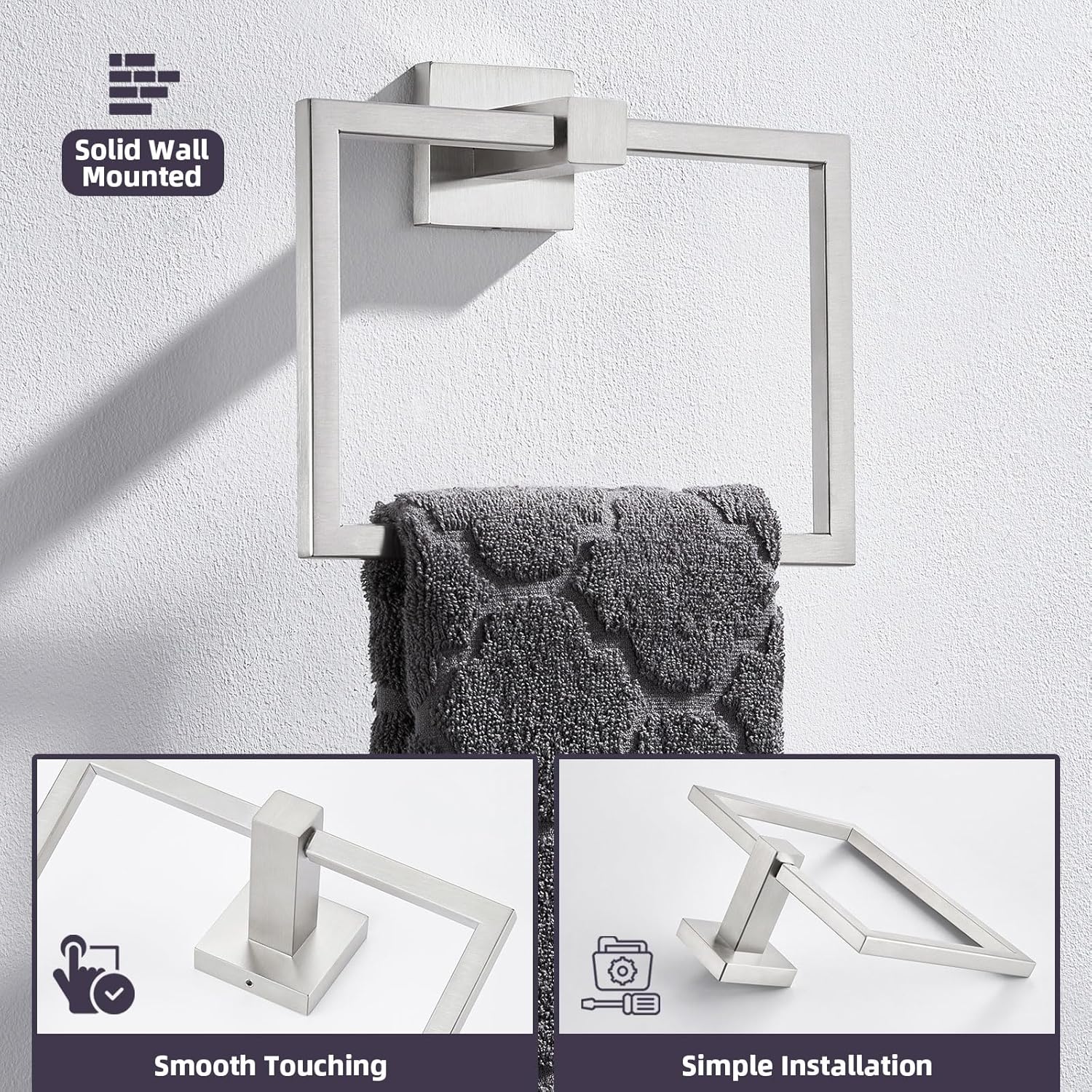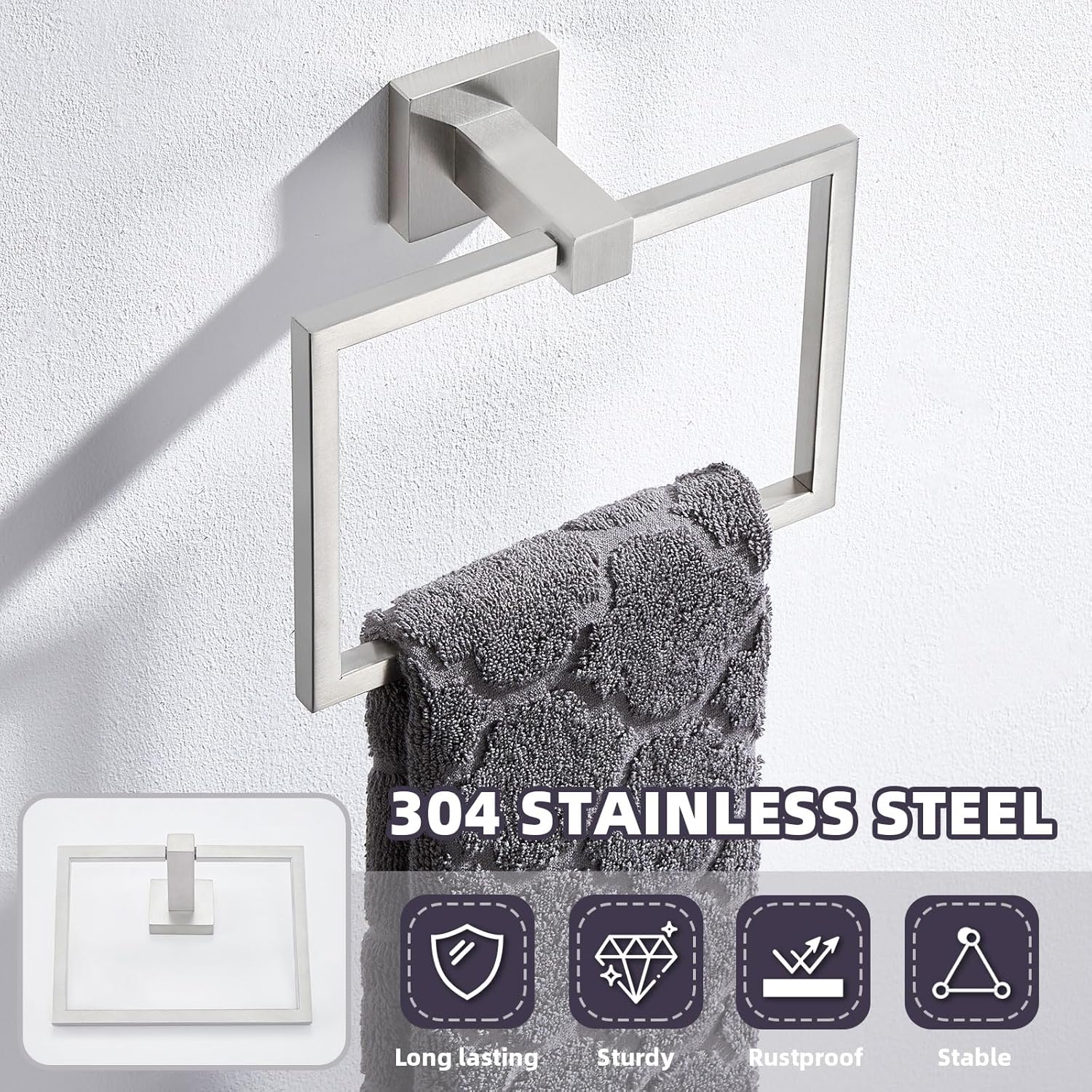 - SPACIOUS SQUARE HANGING RING: 6.3" (16 cm) large inner diameter of towel ring, wide enough to hold hand towel fully. Wall mount towel hanger utilize wall space, keep towel neatly hung, great for towel storage