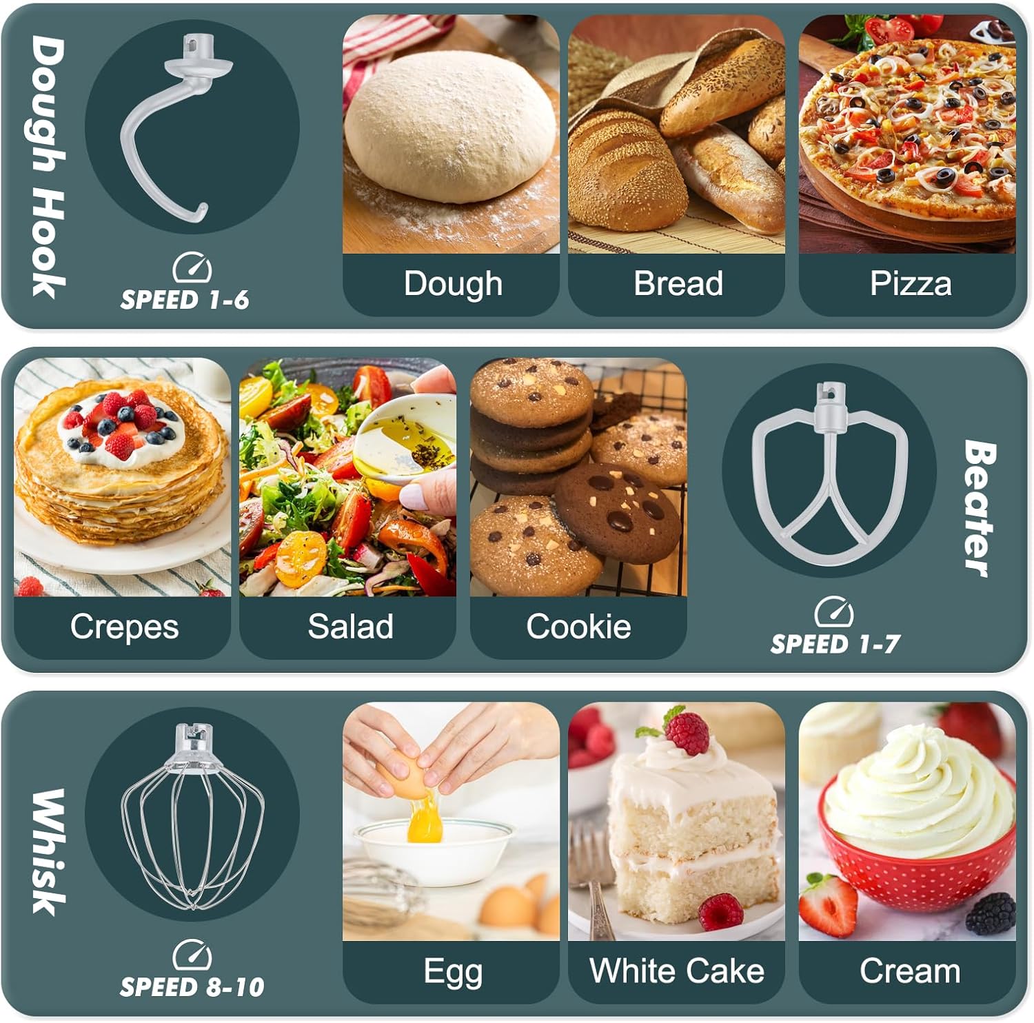 - 10 Speeds and Tilt Head Design - This small kitchen mixer has 10 different speed options,suitable for mixing bread dough, thick batters, meringues, and whipping cake cream, plus lower speeds for stirring and finessing your most delicate concoctions,could suit perfectly to different ingredients. Tilt-head design mixer allows access to install or uninstall bowls and accessories easily.