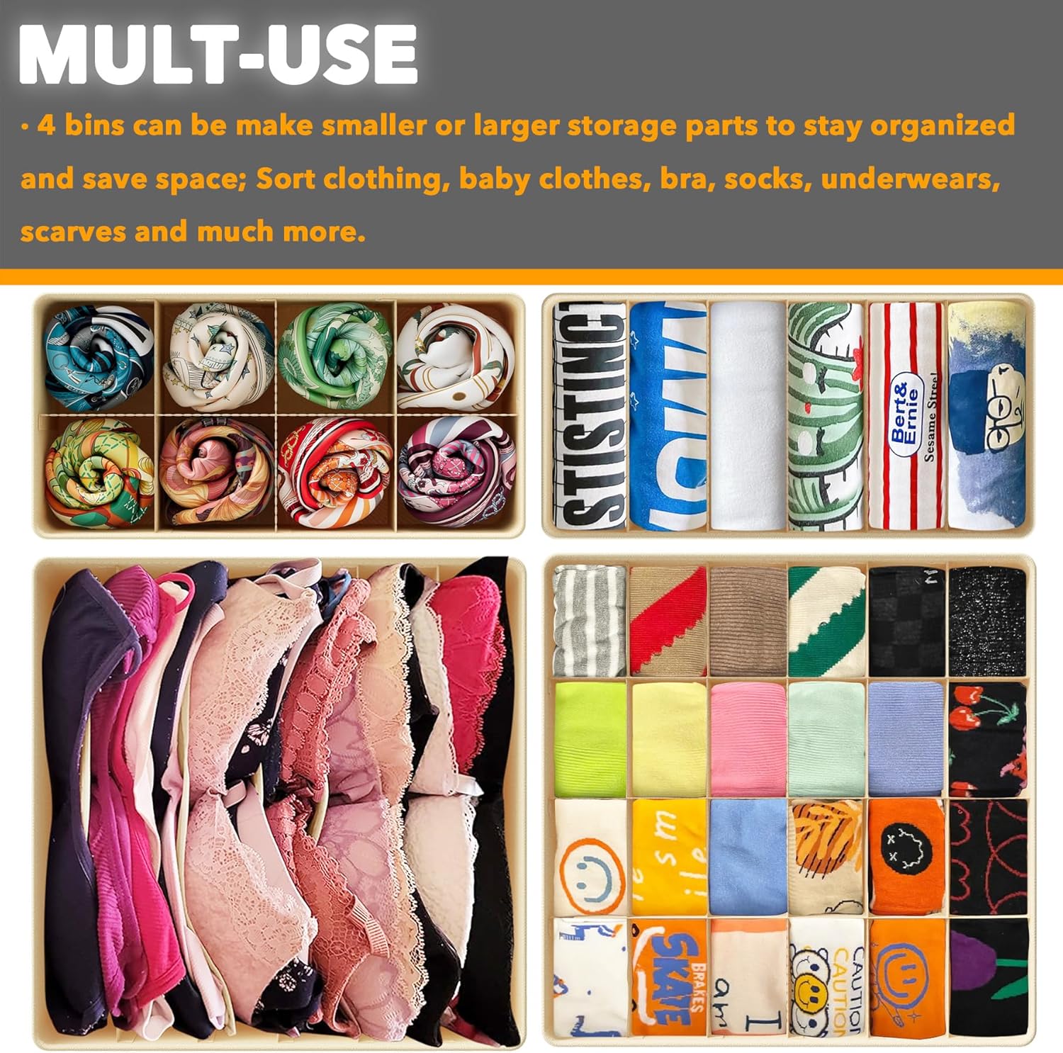 - Mult-use: 4 bins can be make smaller or larger storage parts to stay organized and save space; Sort clothing, baby clothes, bra, socks, underwears, scarves, tools, cutlery, medicine, vitamins, jewelry, makeup and much more.