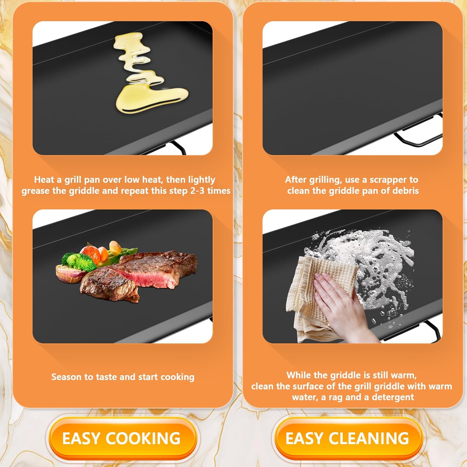 - Premium Quality: This flat top griddle crafted from durable material, special sturdy construction and evenly heated. Before using the griddle plate, you can season it first. Convenient for your use. When used correctly this camping stove griddle heats food evenly and cooks delicious meals. Note: When seasoned with cooking oil before use, fry griddle creates a natural non-stick surface that makes cleaning a breeze and extends its life.