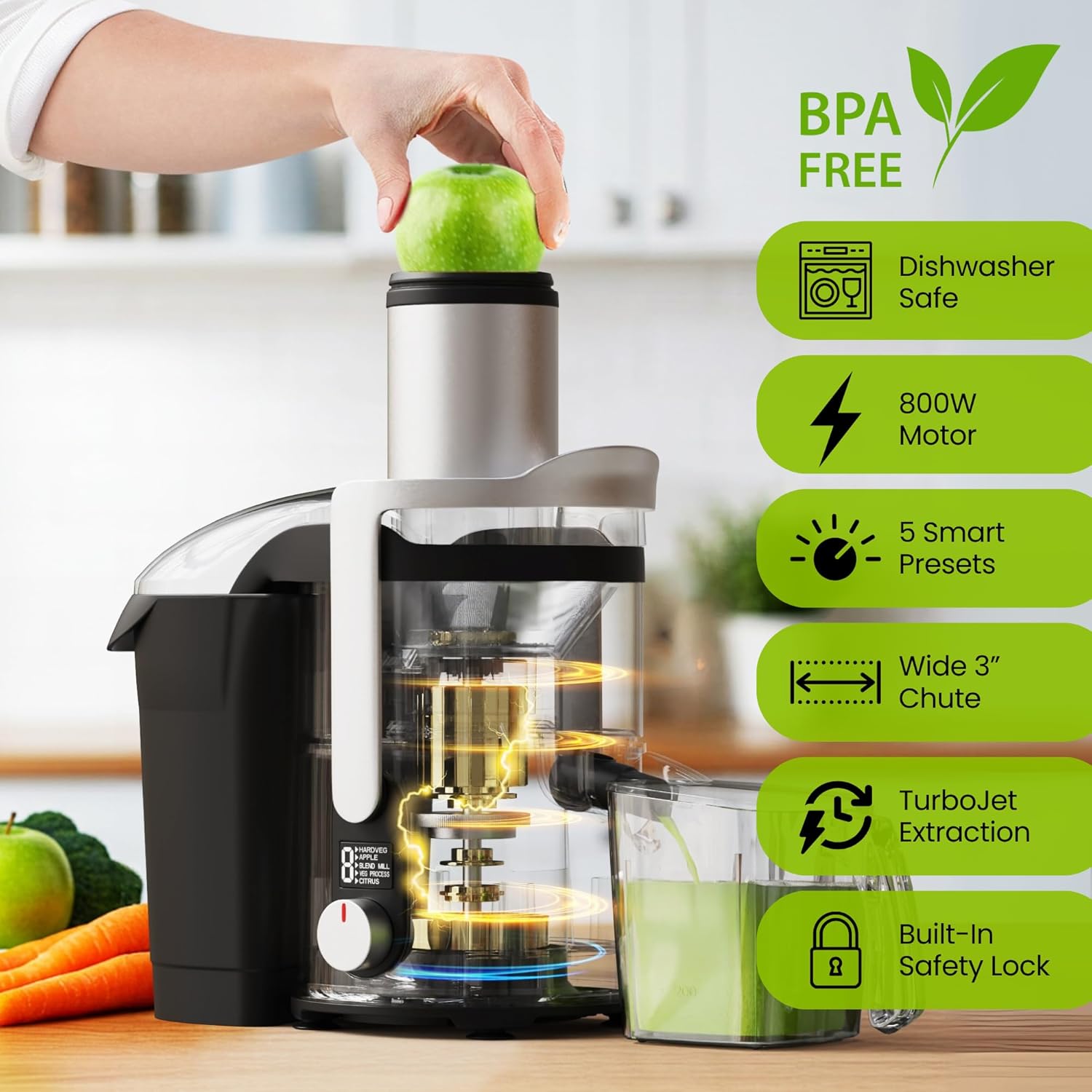 - TURBOJET EXTRACTION SYSTEM – MAXIMUM JUICE IN SECONDS — Power through your produce with the Eurolux TurboJet Extraction System—our high-speed, 800W centrifugal mechanism that separates juice from pulp in under 10 seconds. Whether you're juicing carrots, kale, apples, or oranges, you get a smoother texture, brighter flavor, and more yield per batch. Less foam, less waste, and no need to re-strain. Designed for busy mornings and health-focused households.
