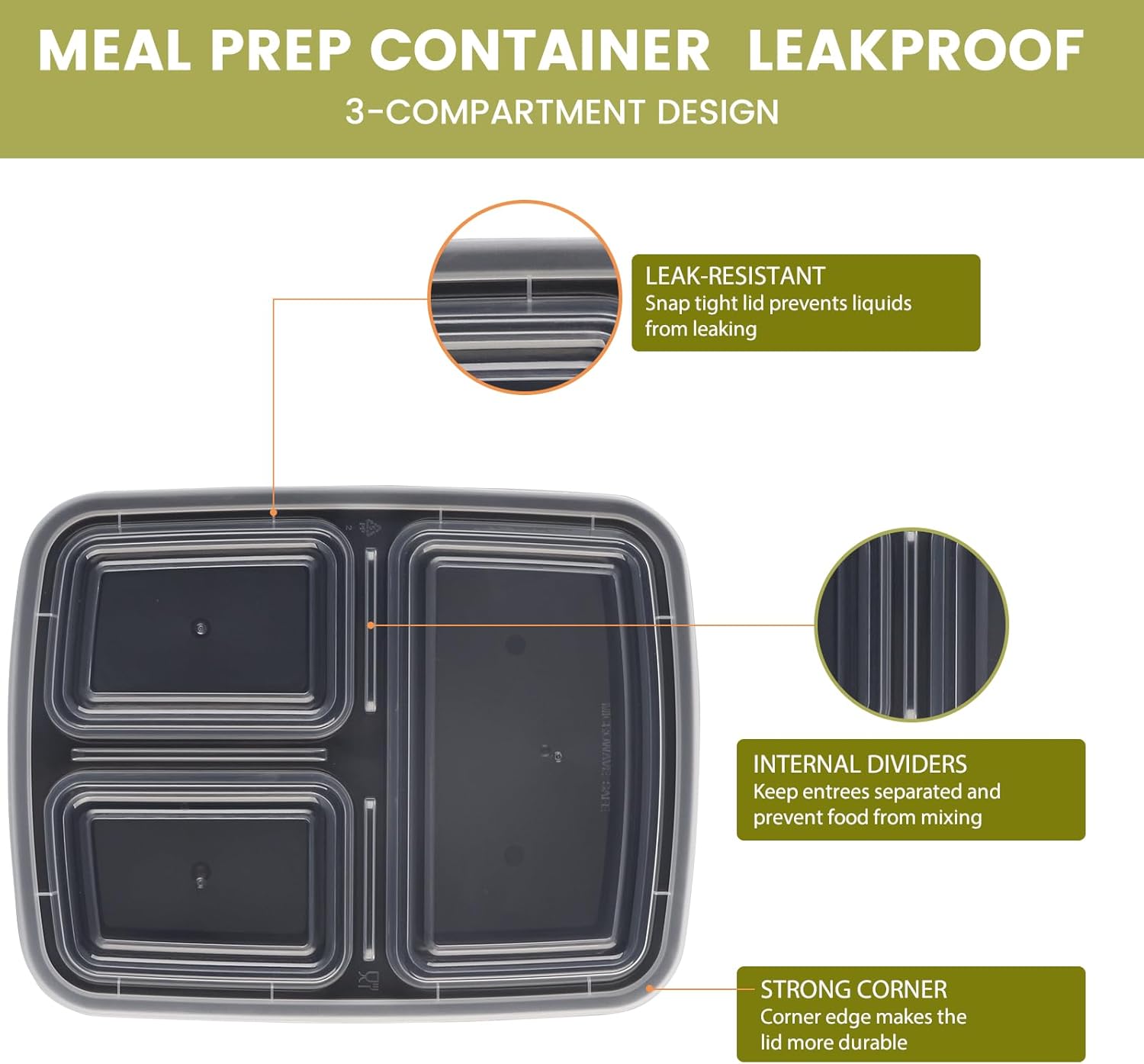 - Included Components : 20 x Leakproof Lids, 20 x Meal Prep Containers 3 Compartment (32oz.)