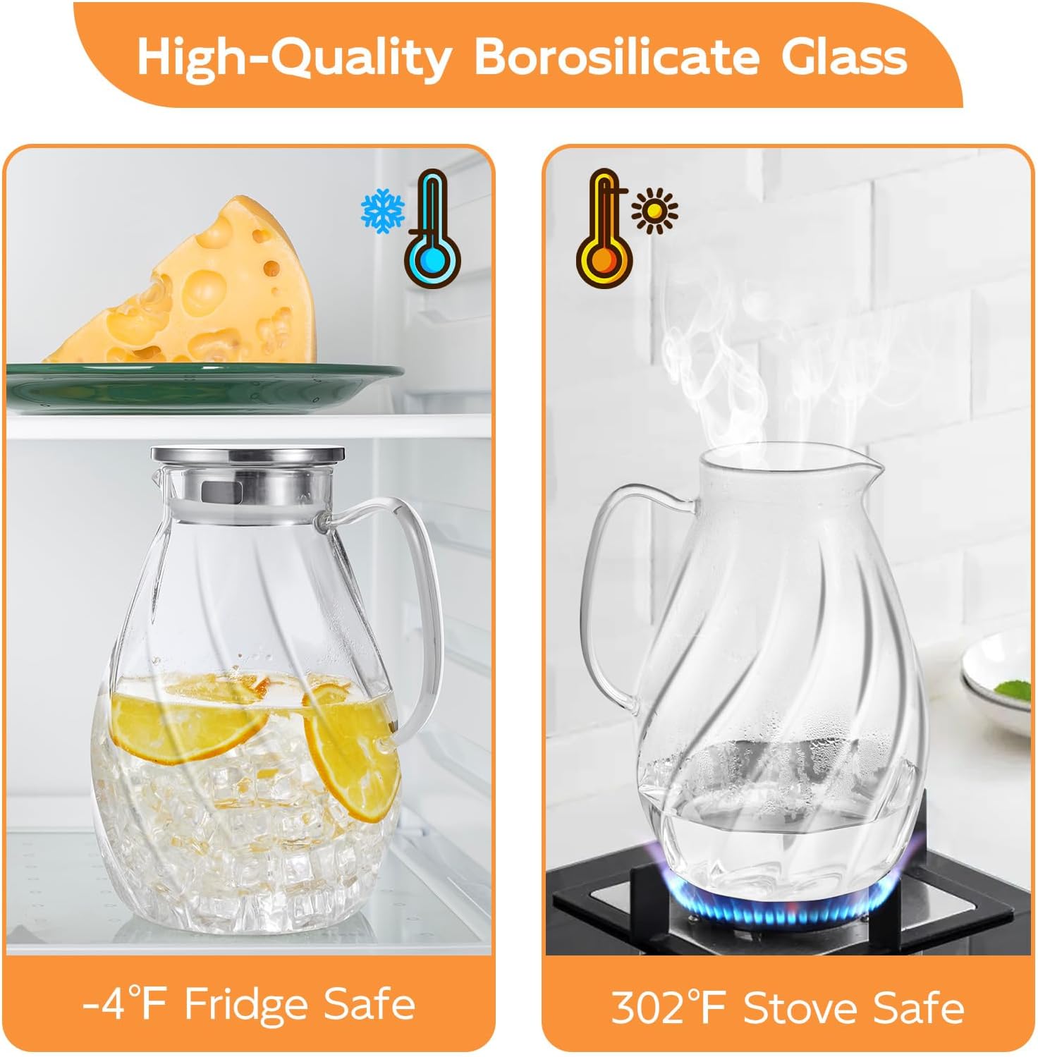 - GLASS WATER PITCHER: DRASTAR glass water pitcher has a large capacity of 74 oz. The glass pitcher with lid can withstand quick temperature changes(-4℉ to 302℉), suitable for all cold and hot drinks. Great for juice, kombucha, sun tea, fruit tea, sangria and more