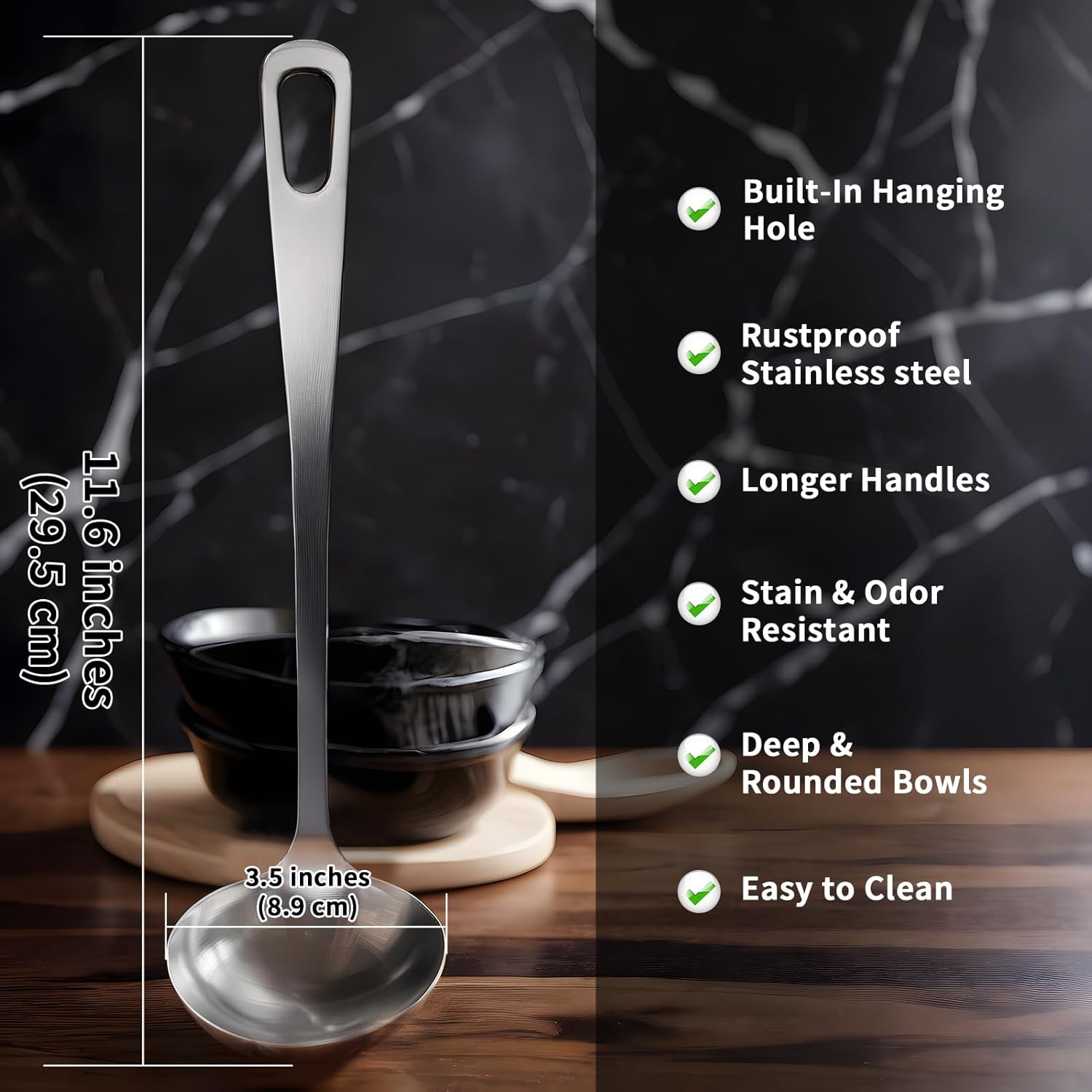 - DURABLE & EASY TO USE: We have designed our stainless-steel ladle with the craftsmanship and excellence that Cooks and professional Chefs have come to expect in kitchen utensils. If you love making recipes that are brothy like stew, soup, or saucy Italian dishes like spaghetti pasta and homemade pizza then this stainless steel soup ladle is the perfect tool for you.