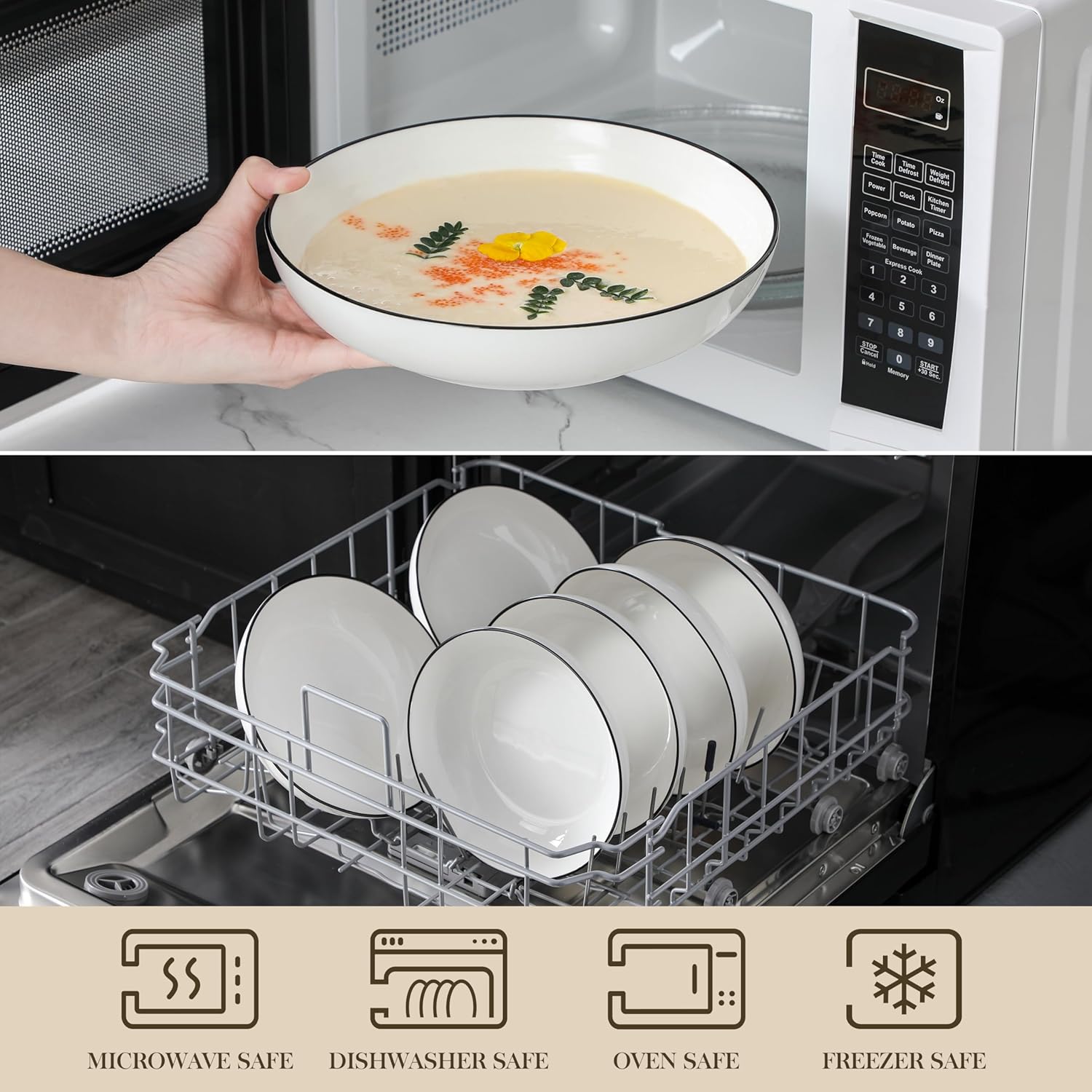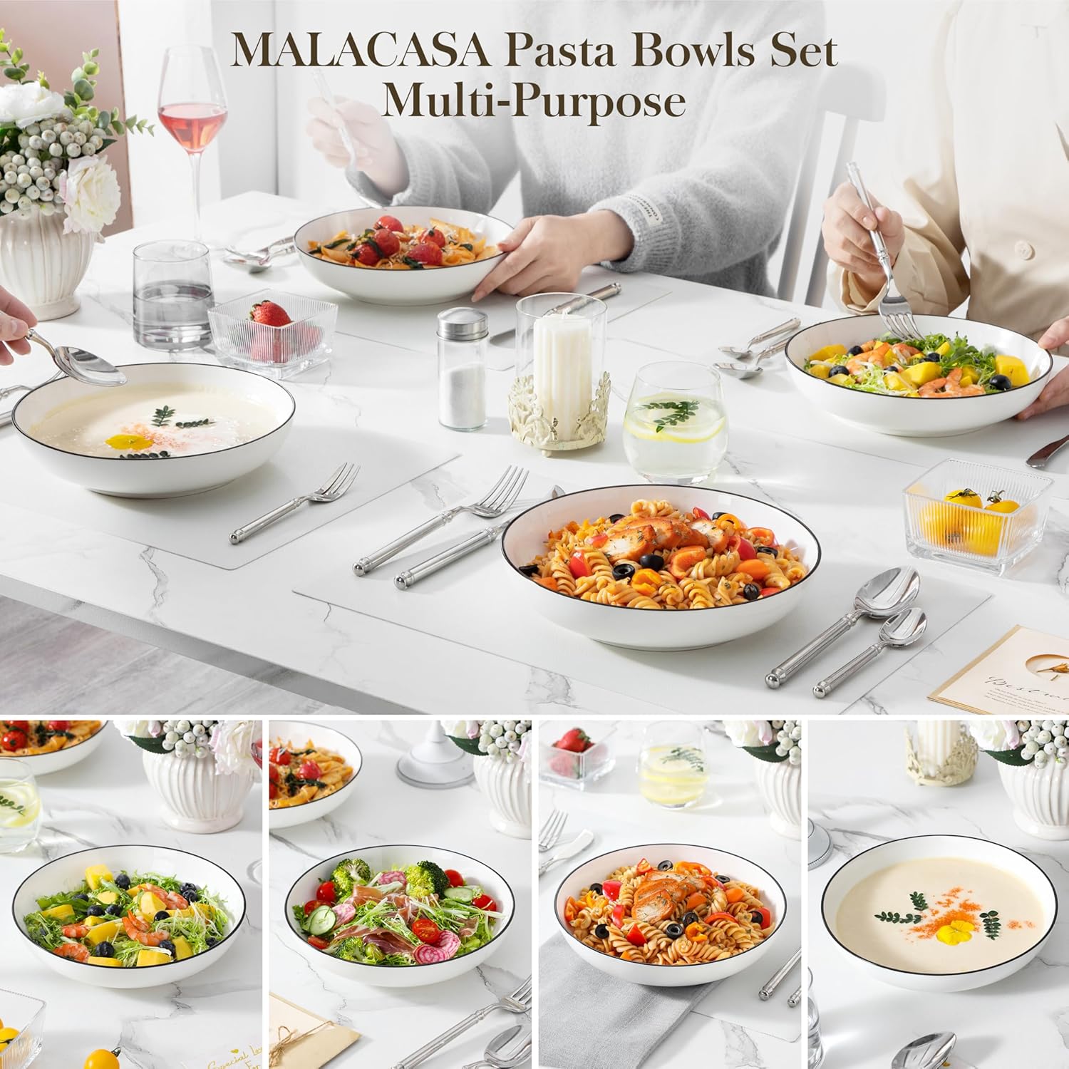 MALACASA 8.85" Large Pasta Bowls, 42 OZ White Salad Bowls Soup Bowls, Porcelain Serving Bowls Set of 4, Ivory White & Black Rim, Microwave & Dishwasher Safe, Series REGULAR
