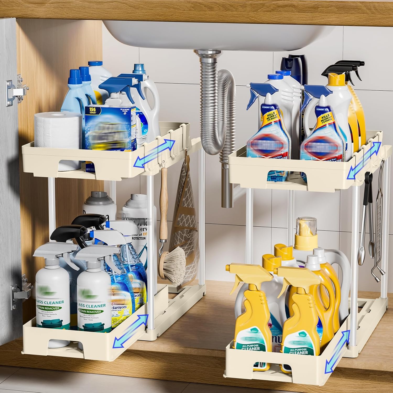 - Efficient Dual-Layer Pull-Outs: The double-drawer design of our under cabinet storage significantly enhances space utilization and accessibility. Our undersink organizers streamline both storing and retrieving items, and saving you time for cleaning supplies organizer, medicine cabinet organizer, and home organization.