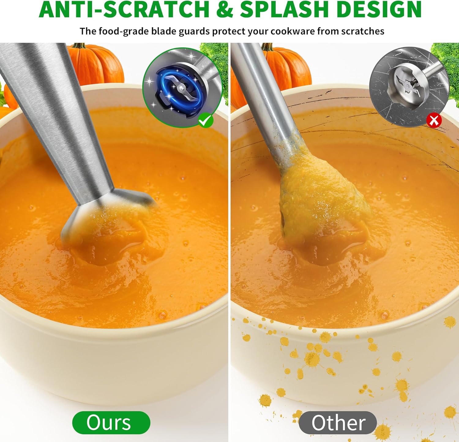 - γππππ-πππππππ & ππππ-ππππππγ: The 304 stainless steel blades are sharp and durable, easily blending large or tough ingredients (Tips: Not suitable for very hard items like ice cubes or coffee beans). The food-grade semi-enclosed blade guard safe to use even in hot soup. It protects your containers from scratches and effectively prevents splashing, keeping both you and your kitchen clean.