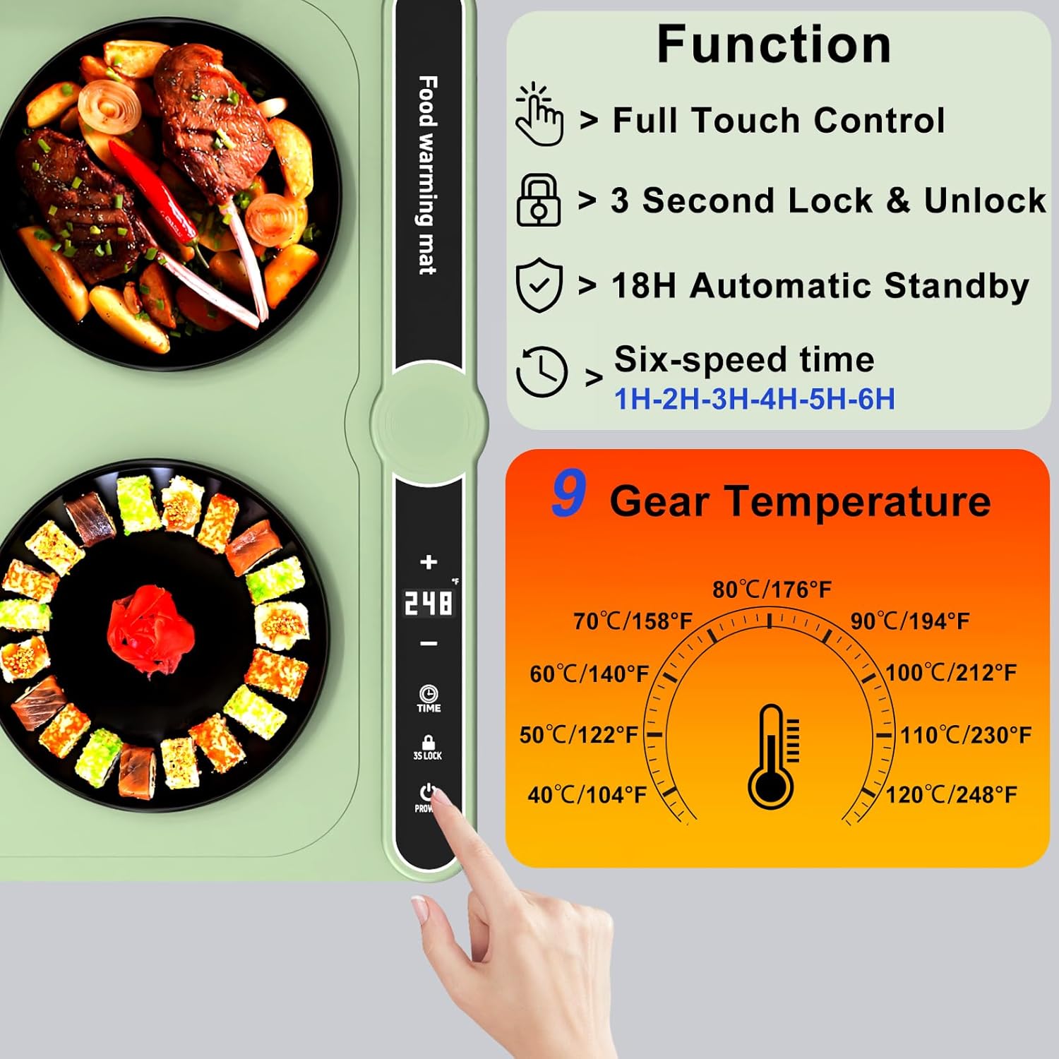 - Variety of Functions: This rollable food warmer mat features has 9_level adjustable temperature from 104β to 248β (40β-120β). Maximum 6-hour timing model and 18-hour auto shut-off timer. The touch screen design allows you to easily operate the food warm tray