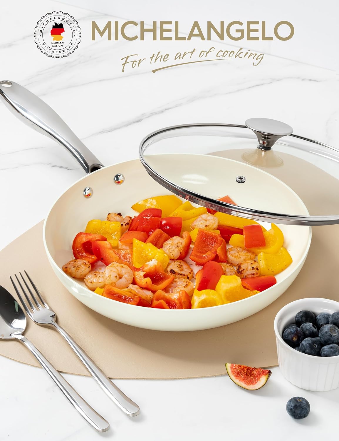 MICHELANGELO 10 Inch Frying Pan with Lid, Nonstick Fry Pan with Ceramic Coated, Induction Compatible Skillet, PFAS & PFOA-Free, White
