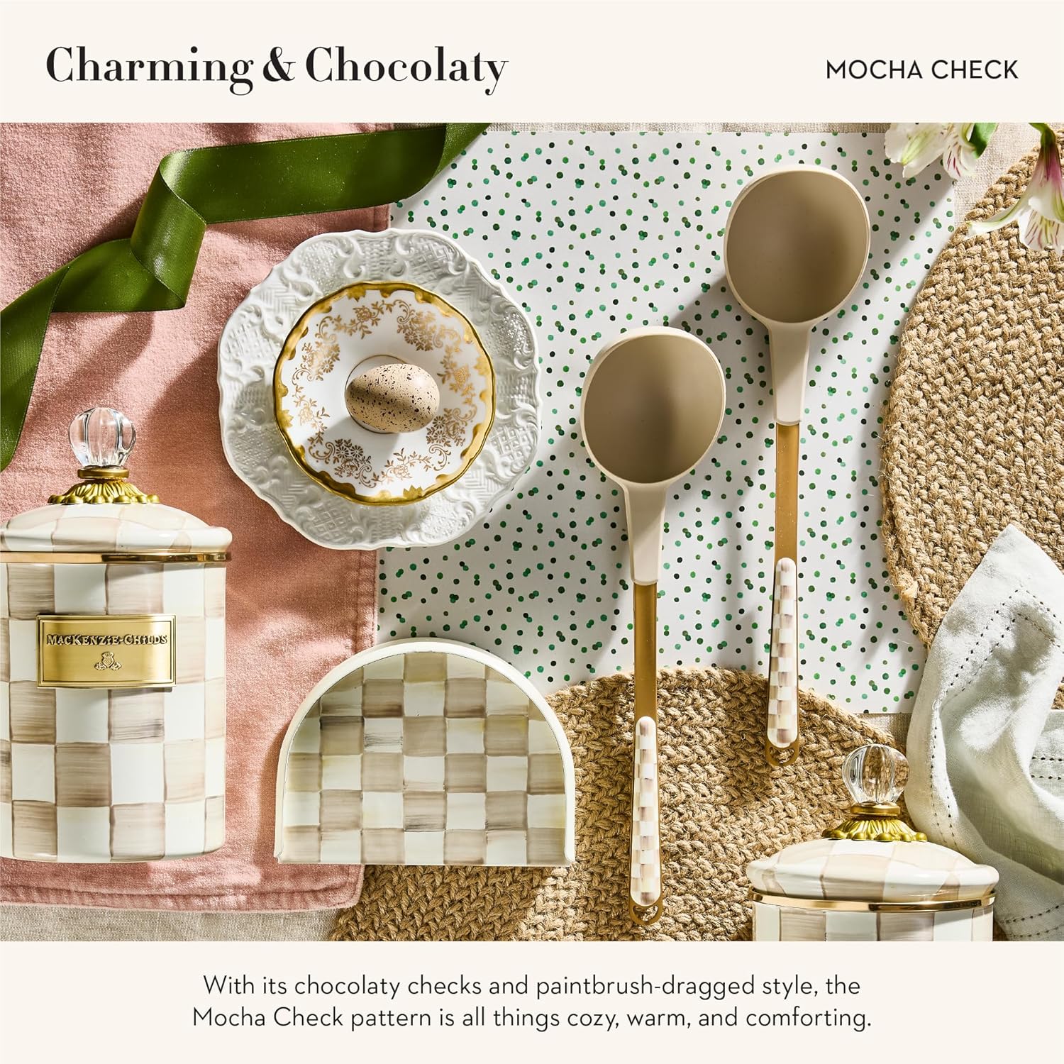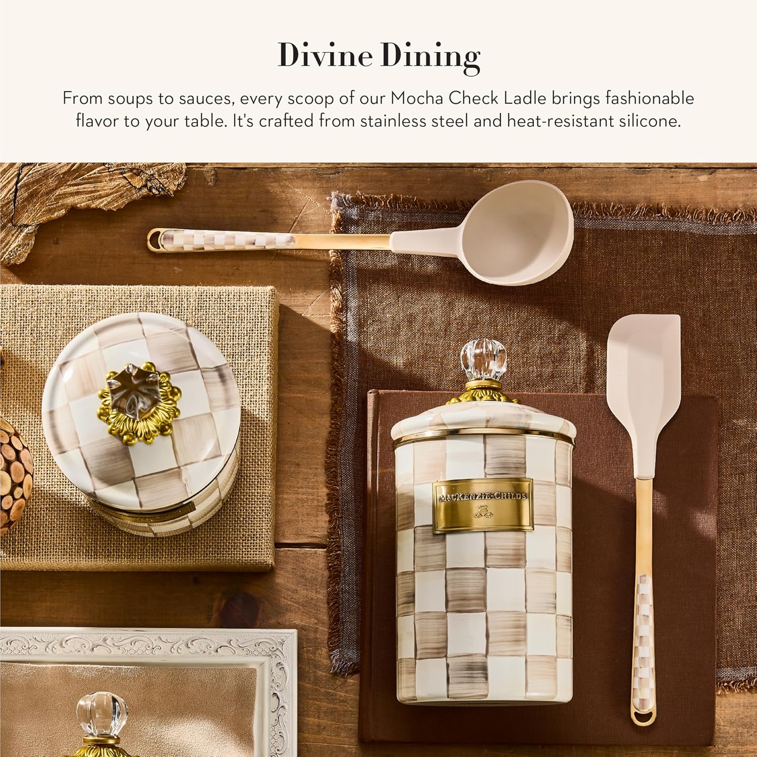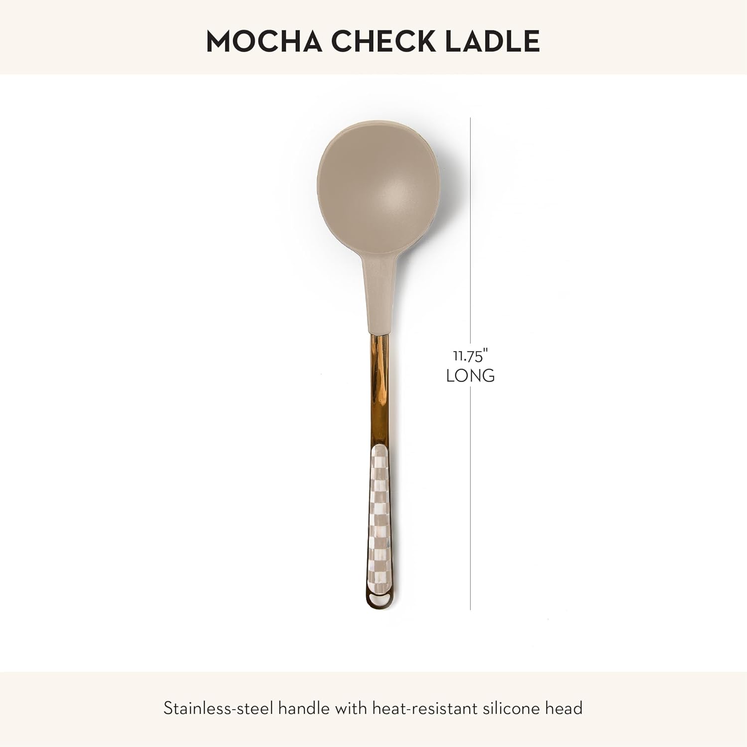 - ELEGANT SERVING ESSENTIAL: This cute serving ladle features our charming brown-and-white Mocha Check pattern. It is crafted with a stainless-steel handle and a heat-resistant silicone top and is a chef-worthy serving tool.