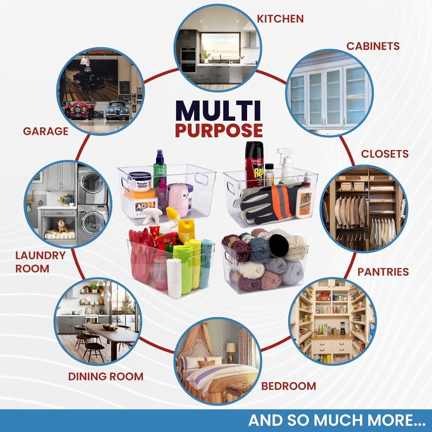 - YOU WON'T FIND A MORE VERSATILE SET OF BINS: You can use these large clear plastic storage containers with lids for organizing any space in and around your home โ the kitchen, cabinets, closets, pantries, bedroom, dining room, laundry room, nursery, garage, kids toy room, under sink organizers and more.