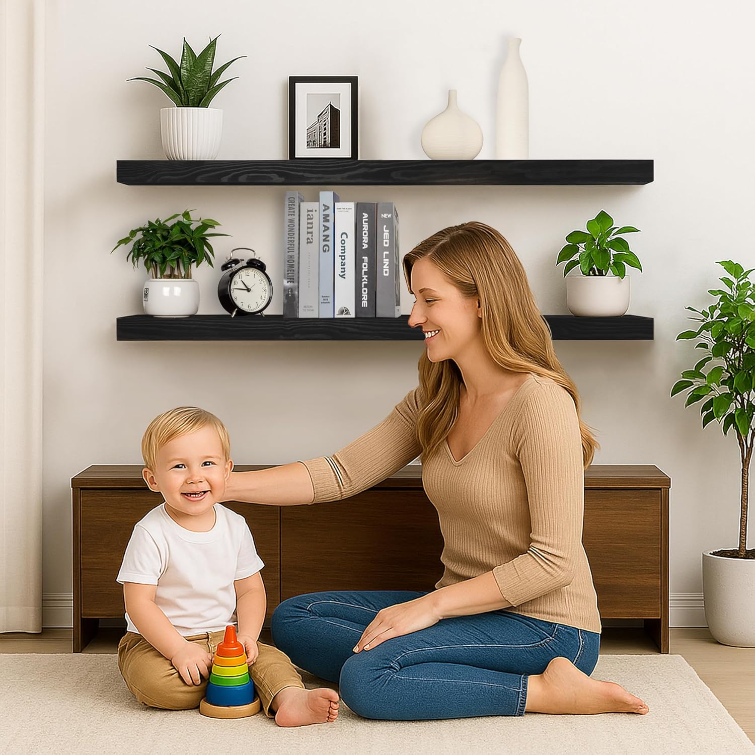 - Solid Wood Floating Shelves: The 60 inch black wood Floating Shelf is made from 100% solid pine, selected for its beautiful wood grain texture and knotted into points, with a sanded, hand-stained finish that gives the space a rustic, natural, warm feel. Note: All steps are done by hand and each ledge is slightly different, but equally stunning!