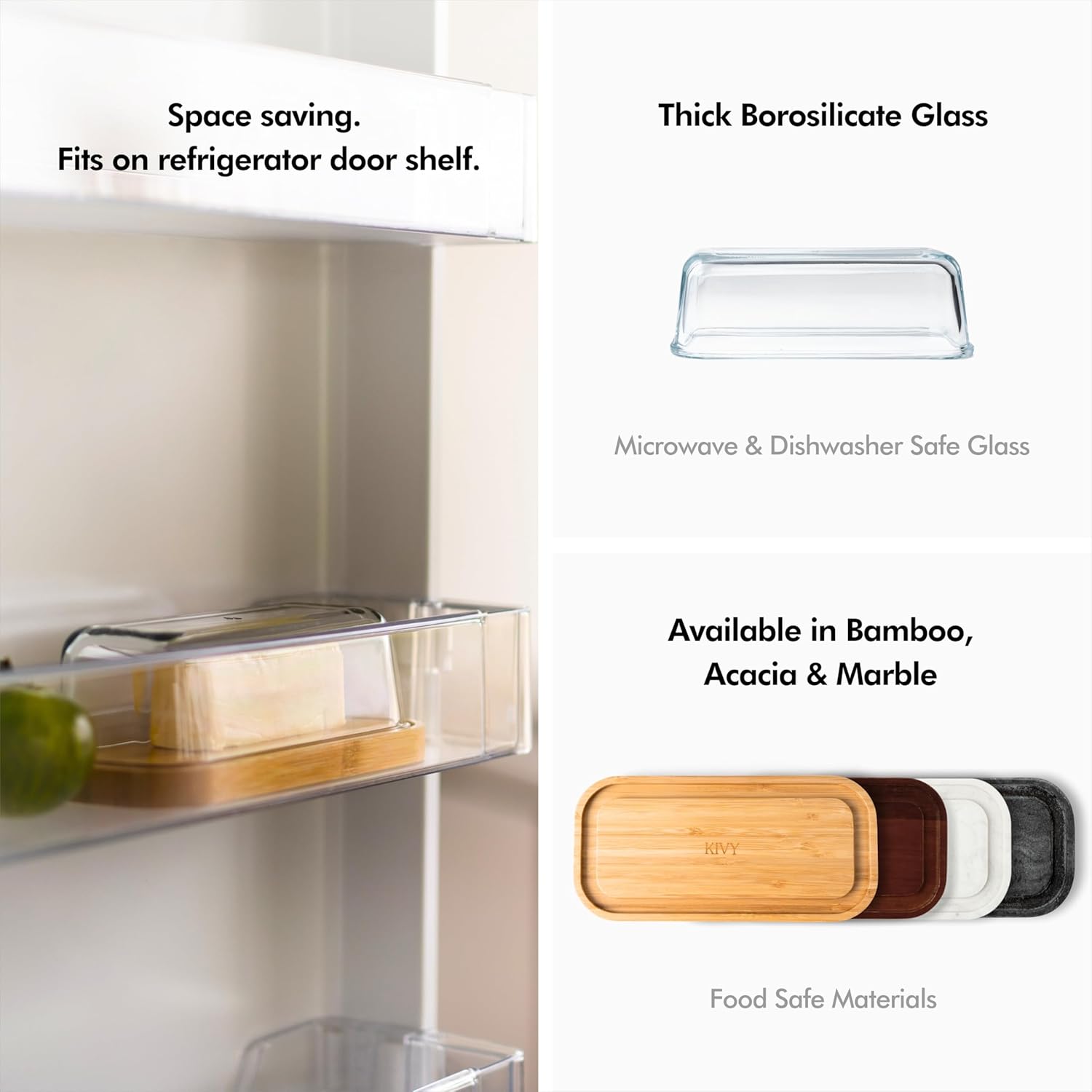 - GLASS LID KEEPS CLEAN - The marble butter keeper fits all common butter sizes and the butter doesn’t touch the glass lid. The butter tray is very space saving and also fits on refrigerator door shelf.