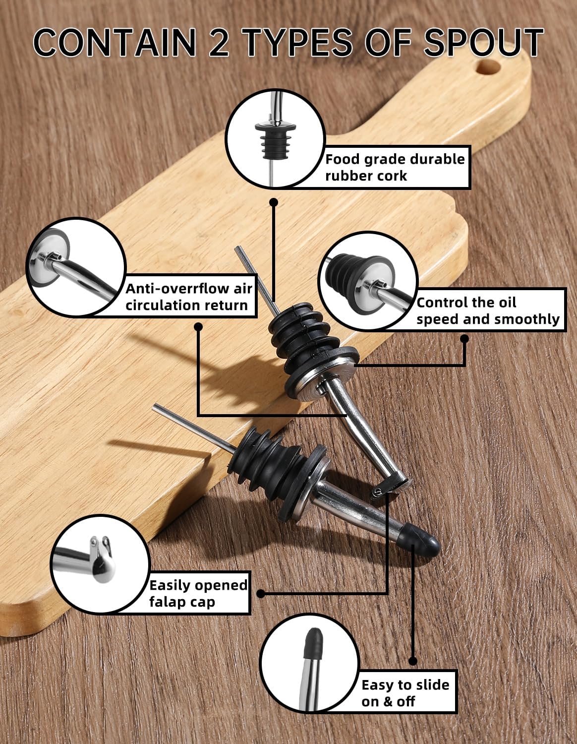 - Two Controlled Pouring Spouts - 18/8 Stainless steel pour spouts with sealed cap or flap cap, fit the bottle well and keep dust out. The pouring fluid is smooth without sticking and can easily dispense the right amount of oil for a healthy diet.