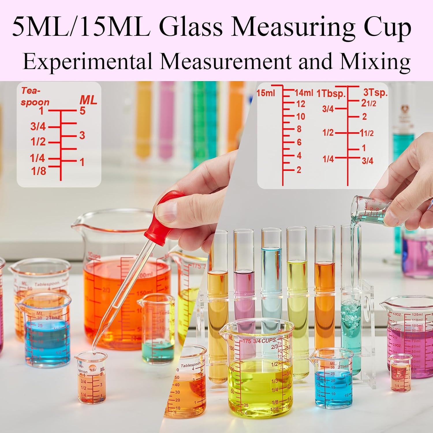 - Complete Measuring Beaker Set β Includes 7 glass beaker measuring cups: 1 tsp (5ml), 1 tbsp (15ml), 1oz (30ml), 2oz (60ml), 4oz (120ml), 5oz (150ml), and 8oz (250ml), covering all baking, cooking, and drink preparation needs