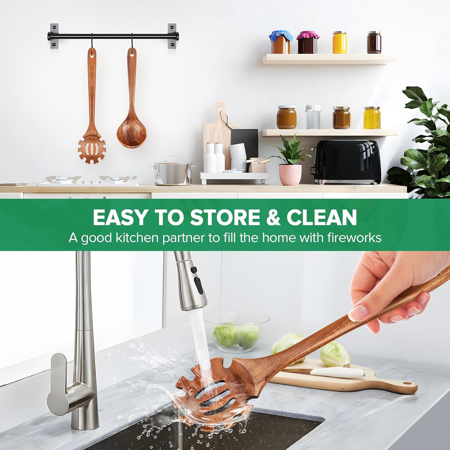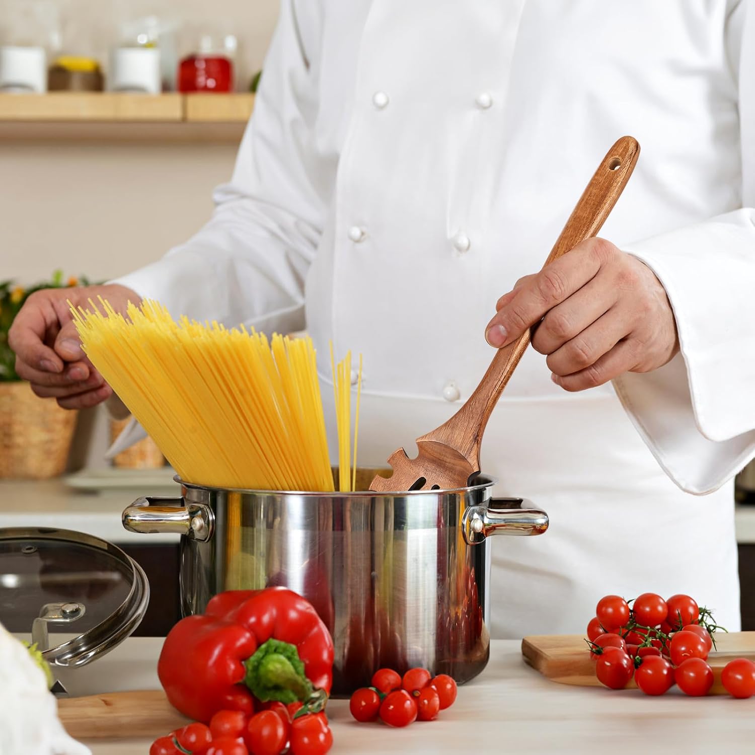 - Premium Material:This wooden spaghetti spoon is made of food-grade natural teak wood.Non-toxic,no-rust,heat-resistant, bpa-free and healthy for daily kitchen use.Our non-stick wood pasta spoon is also lightweight solid,hard texture, good stability and won't deform easily.