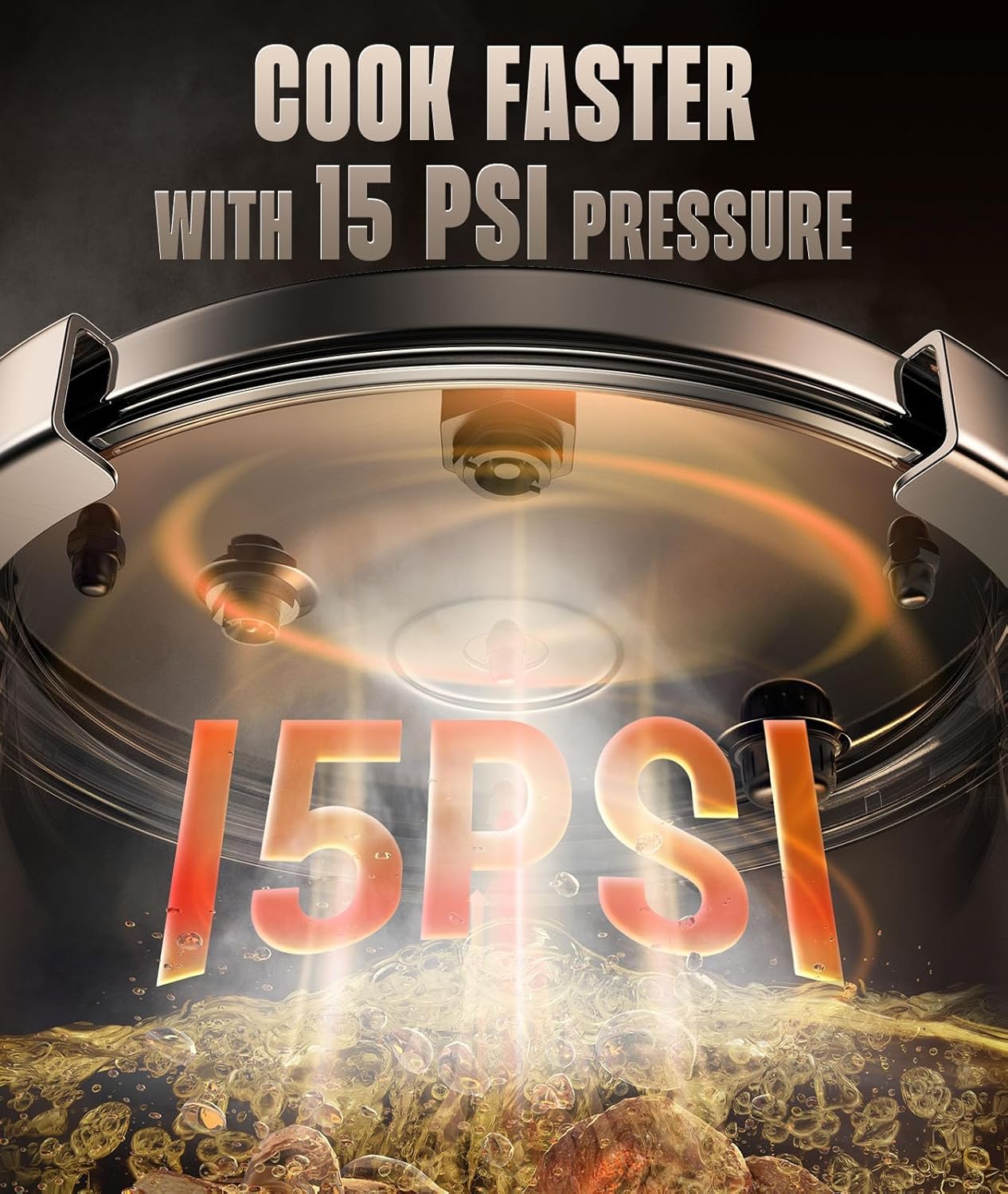 - Save Time with Revolutionary Efficiency - Our stainless steel pressure cooker cuts cooking time by 70% compared to traditional pots and 35% faster than other pressure cookers, thanks to its innovative design. The tri-arm structure ensures a triangular stability, with wider clamp coverage that enhances the sealing capability. Tested to support up to 15PSI of pressure, it accelerates cooking like never before! Experience the ultimate cooking convenience, delivering quick and delicious meals for every family!