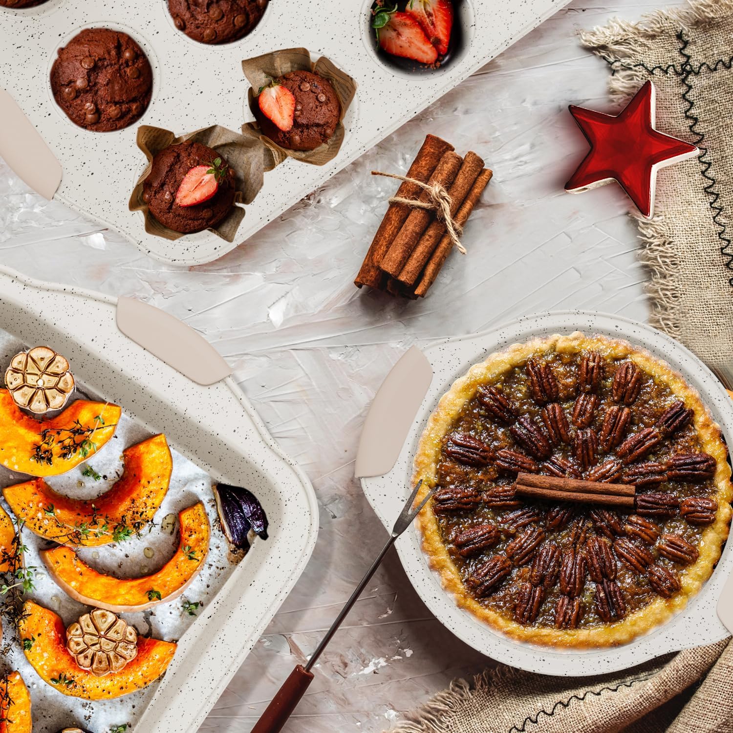10-Piece Baking Pans Set Nonstick, Stackable Bakeware, Toxin-Free Baking Pans Set with Silicone Handles, Includes Cookie Sheets, Cake Pan, Loaf Pan, Pizza Pan, Muffin Pan, White&Khaki