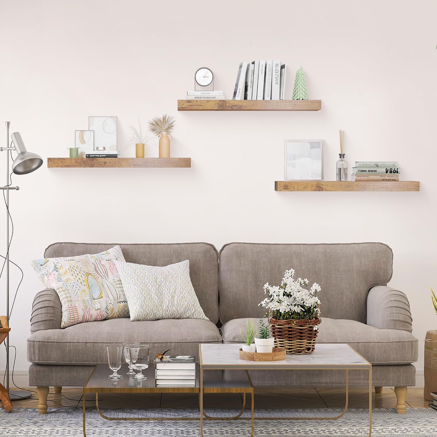 - VERSATILE AND STYLISH DESIGN: Elevate your space with our wall shelves available in wood, black, and white. These floating shelves come in three sizes (15 inches, 24 inches, and 36 inches) and feature a natural wood texture that blends seamlessly with any decor style.