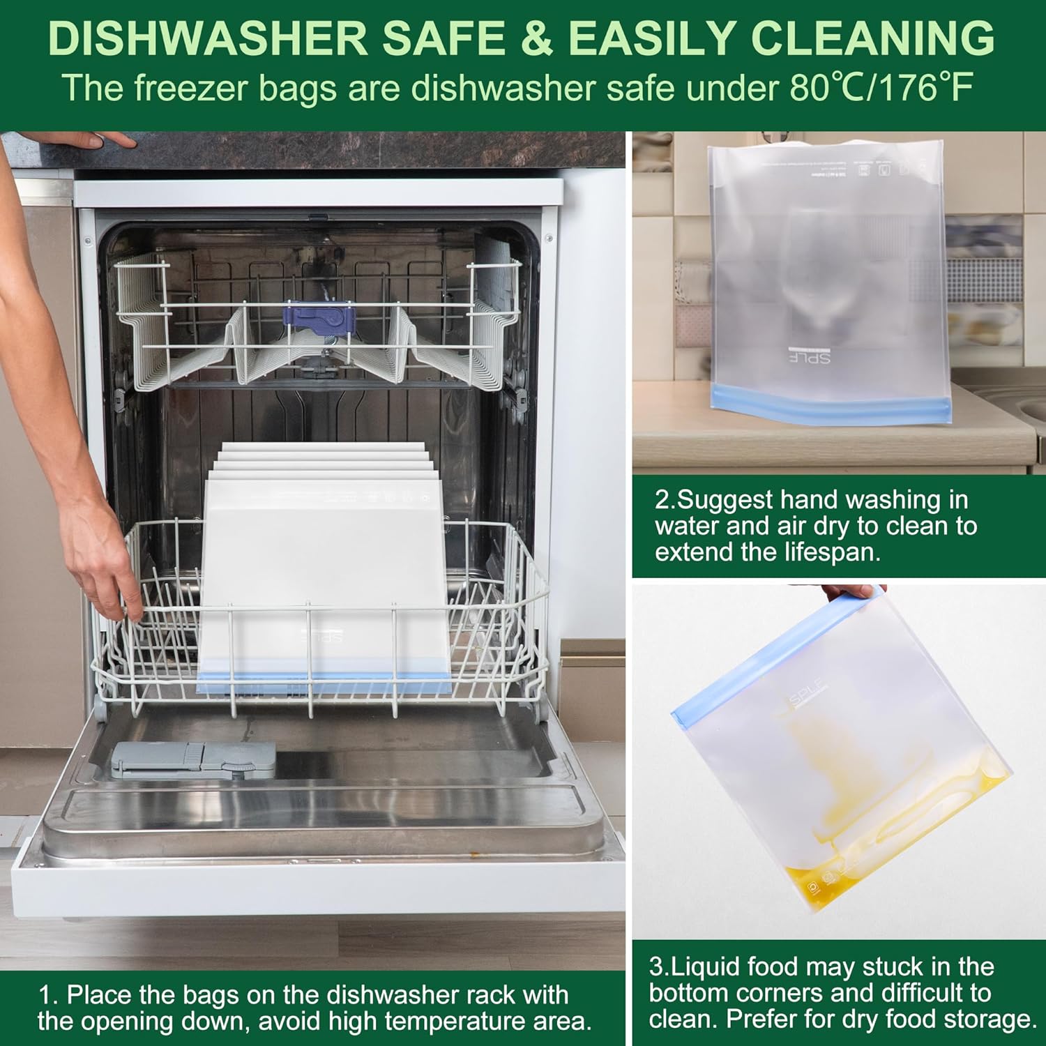 - Freezer & Dishwasher Safe: With heat resistance from -50β/-122β to 80β/176β , the freezer bags silicone can lock out freezer burn while keeping food fresh and full of taste, perfect for freezing meat, chicken, fish, fruits and vegetable. Upgraded PEVA material that is dishwasher safe. however, please skip high-temperature functions such as the dishwasher's drying to extend the lifespan of the gallon bag. We suggest alternating hand wash and air dry to clean for long-term usage. Not microwave friendly.