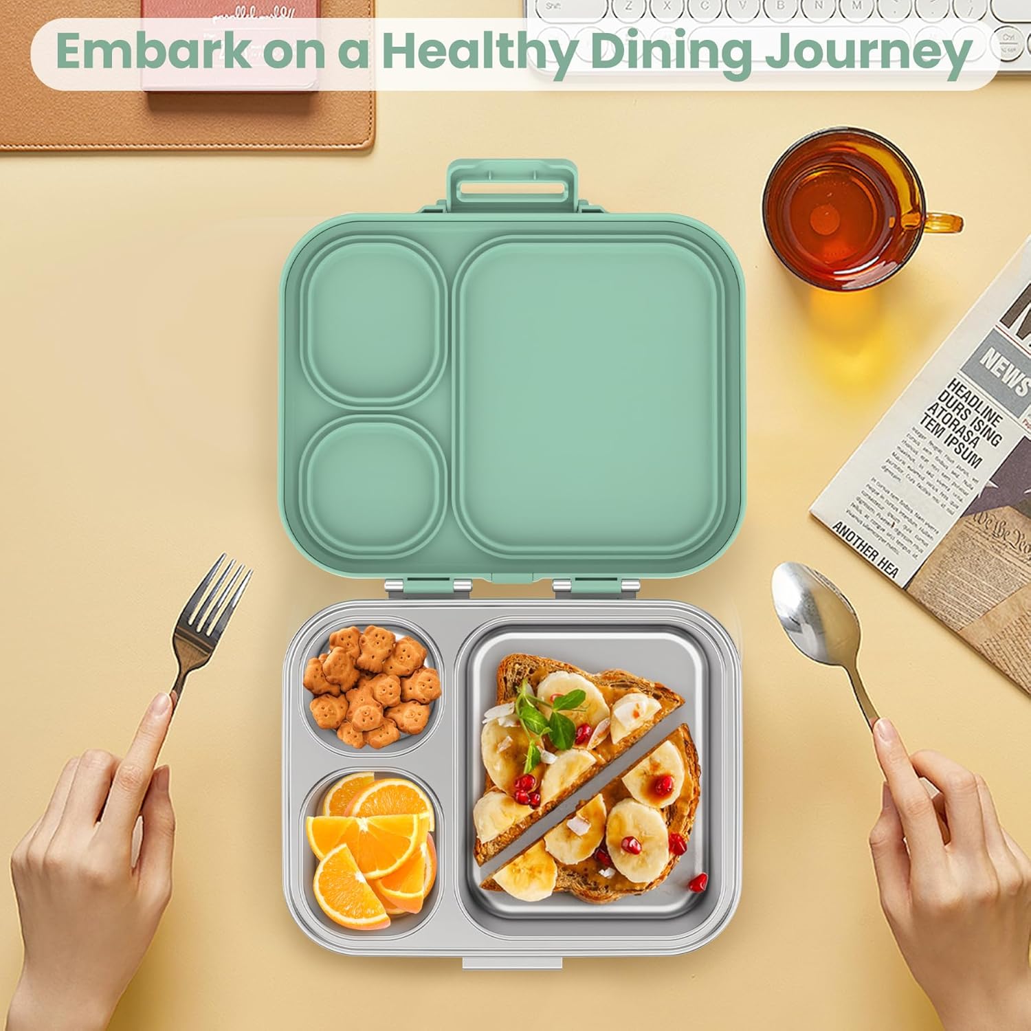 Stainless Steel Bento Lunch Box for Kids | 3-Compartment Lunch Box Container Kids | 100% Leakproof, Dishwasher-Safe, Eco-Friendly, Perfect Portion Control for Kids&Adult Healthy Meals (Green)