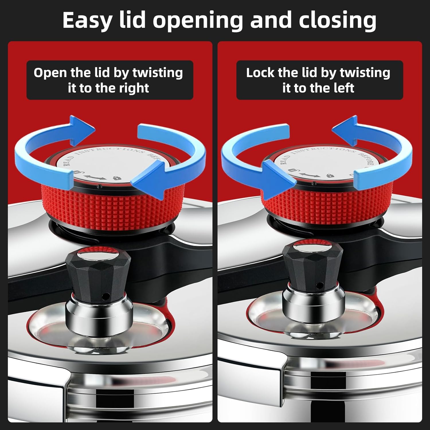 - β [Unique easy-to-lock lid system]-This pressure cooker uses an innovative design for one-handed lid opening and closing, and the lid can be locked or opened in any position by turning the knob with one hand. If the pressure inside the pot increases, the lid cannot be unlocked.