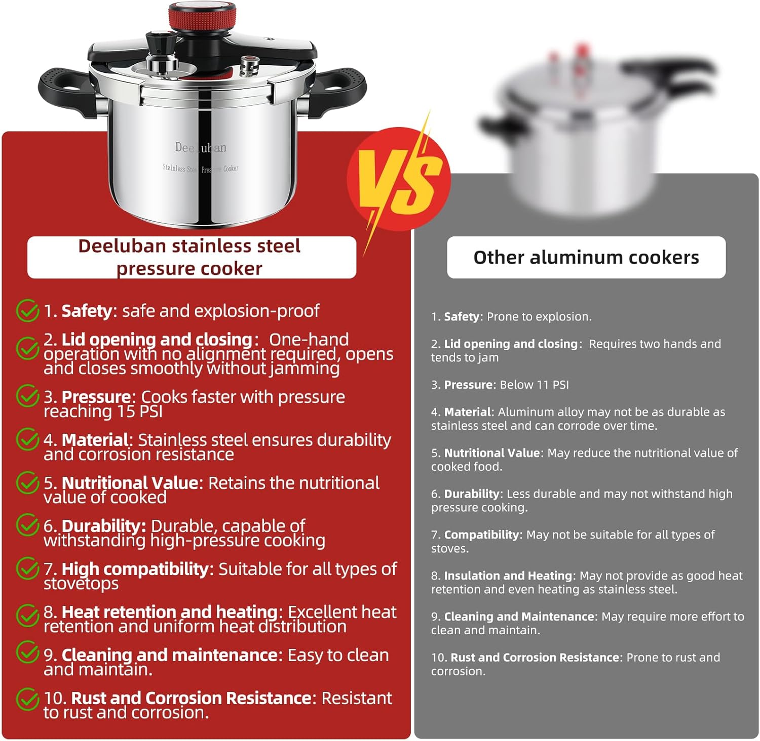 - β [High pressure and fast cooking]-Compared with traditional cookers, the Deeluban pressure cooker reduces cooking time by at least 70%, speeds up cooking with 15 PSI pressure, and helps preserve the precious nutrition and flavor of food. For example, it can tenderize beef tendons in 15 minutes and cook a whole chicken in just 10 minutes.