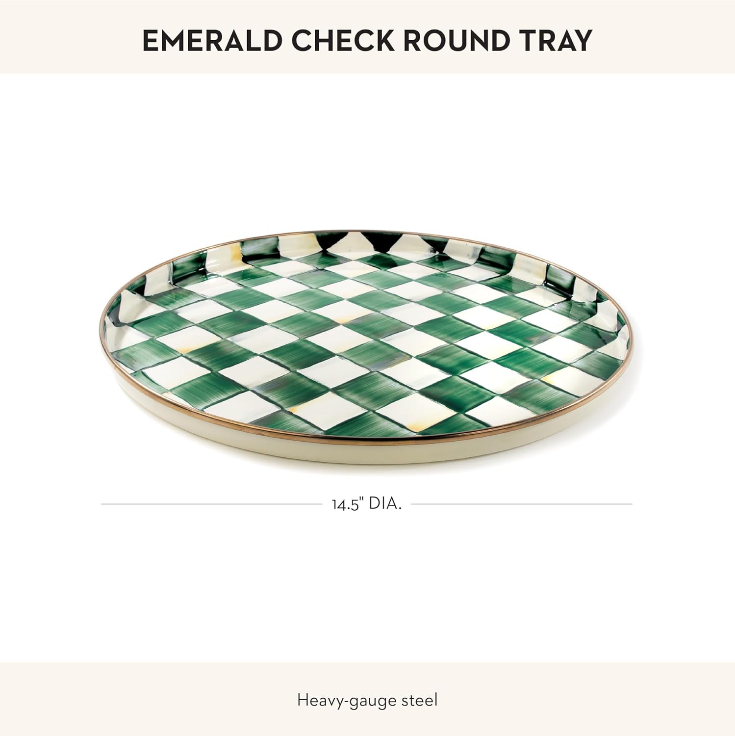 MACKENZIE-CHILDS Enamel Round Tray, Unique Serving Platter for Food and Drinks, Green-and-White Emerald Check