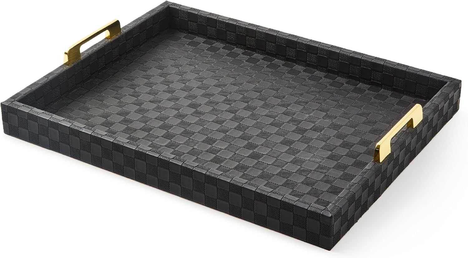 - ELEGANT ROOM ESSENTIAL: Display our chic Black Faux-Leather Tray anywhere. This black rectangle tray features an embossed faux-leather checked surface and shiny gold handles to carry it to any modern table.