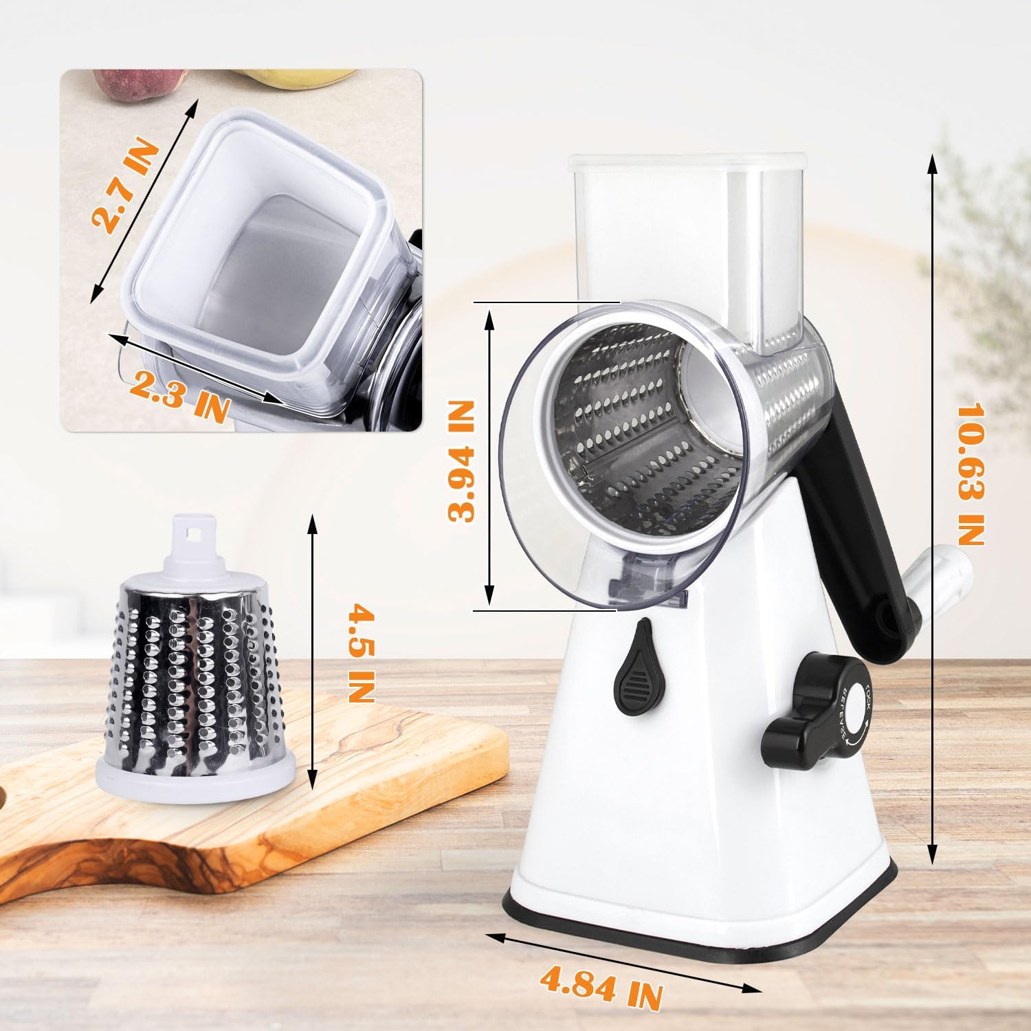 - 【Free Your Hands】Rotary cheese grater has 3 different blades for slicing, coarse and fine cuts, perfect for cheese, potatoes, carrots, nuts, peanuts, etc., to meet your different needs for food,an indispensable tool in the kitchen.
