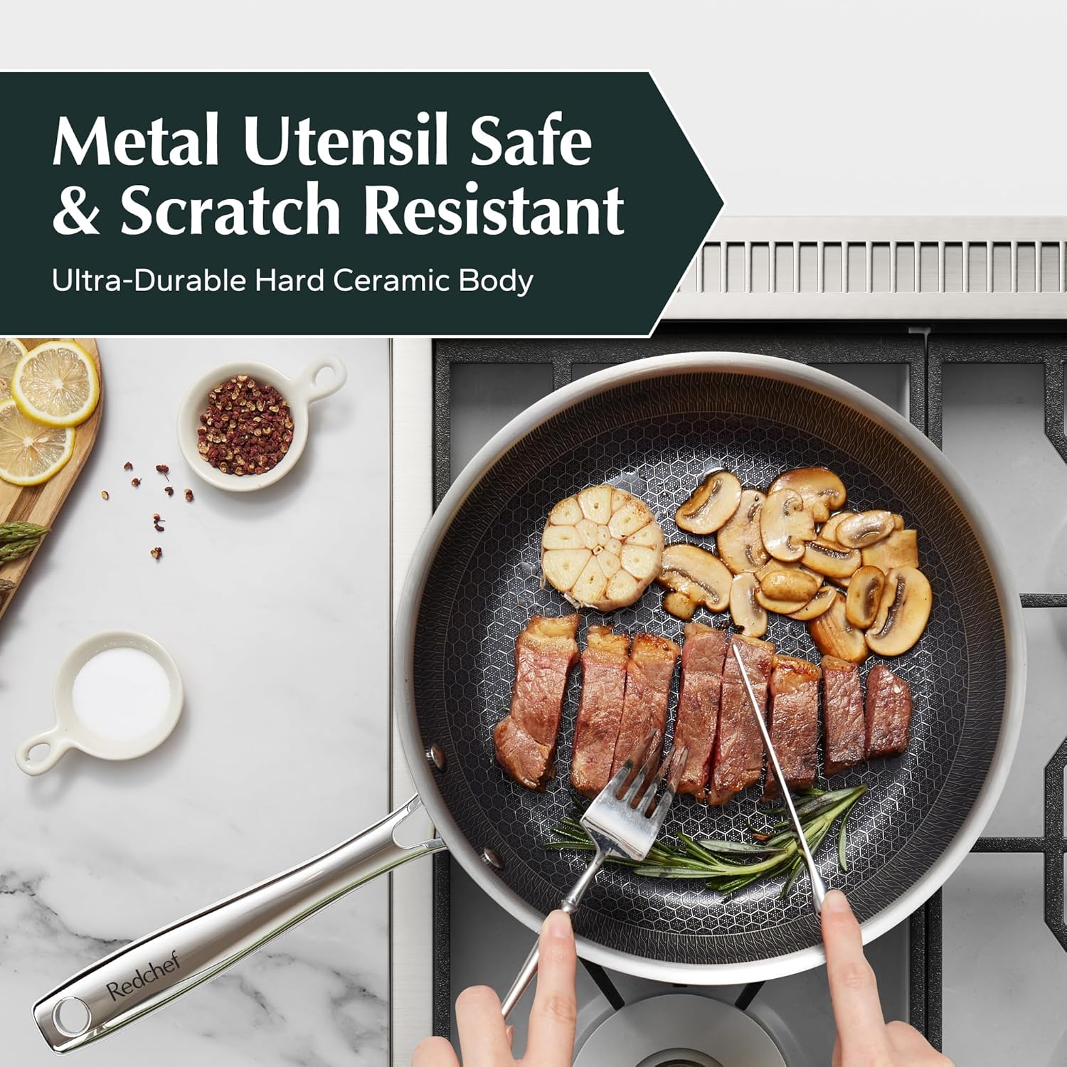 Redchef Non Stick Frying Pans, Hybrid Ceramic Frying Pan, Nonstick Skillet with Stay-Cool Handle, Non Toxic, PFAS PFOA & PTFE Free, Dishwasher & Oven Safe, Compatible All Cooktops (Black, 8 inch)