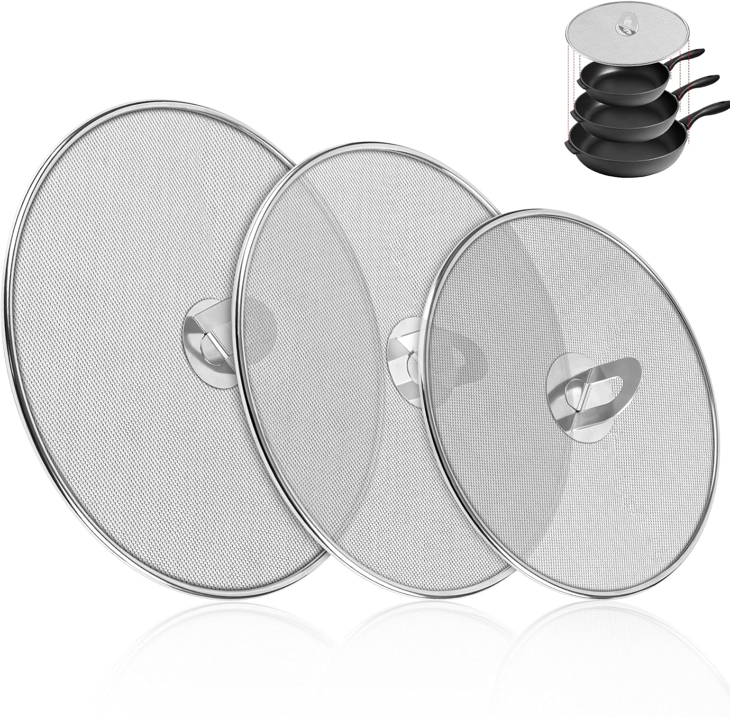 - SET OF 3 FOR MOST PAN SIZES - Our splatter screen set includes 10”, 11.5”, and 13” sizes, designed to fit most non-stick frying pans, skillets, sauté pans, and woks. These grease splatter guards prevent messy oil and sauce splatters, keeping your stovetop and kitchen clean while cooking