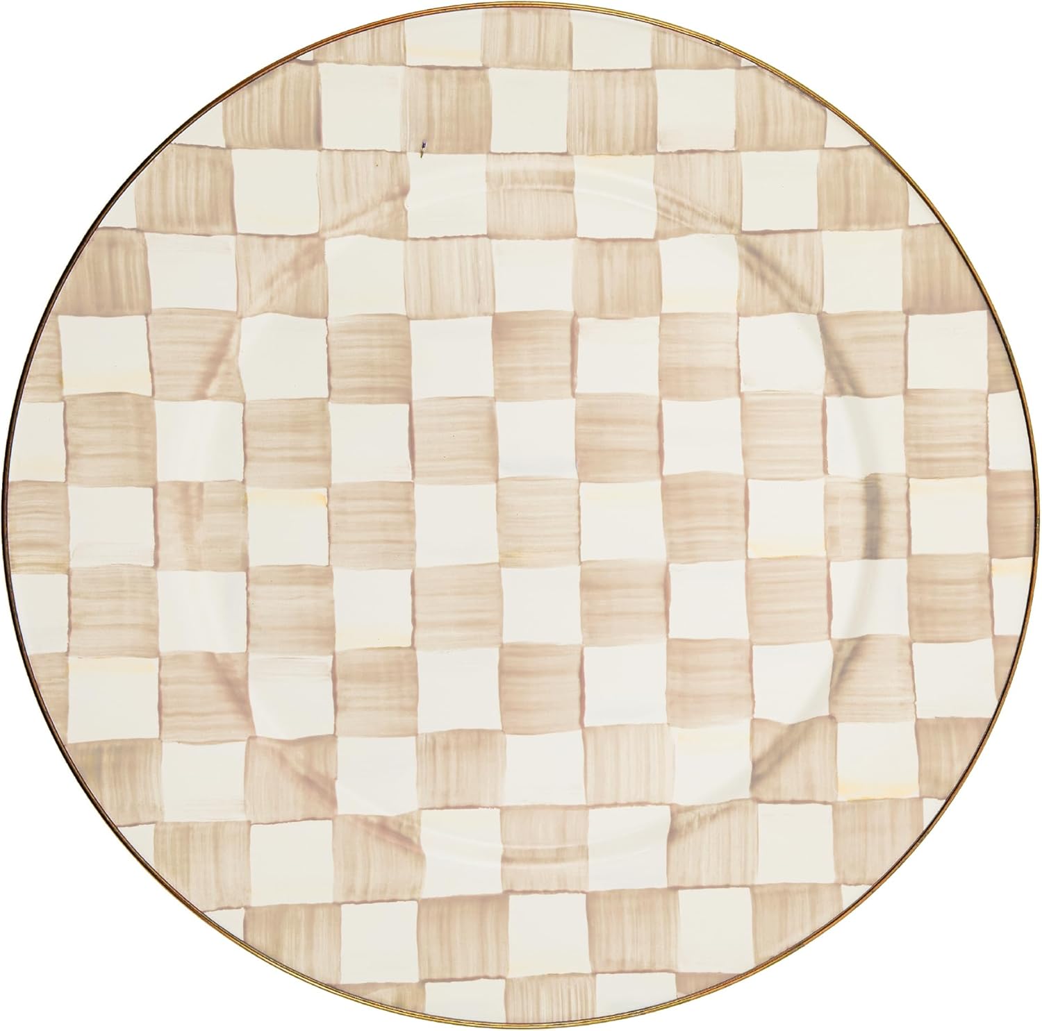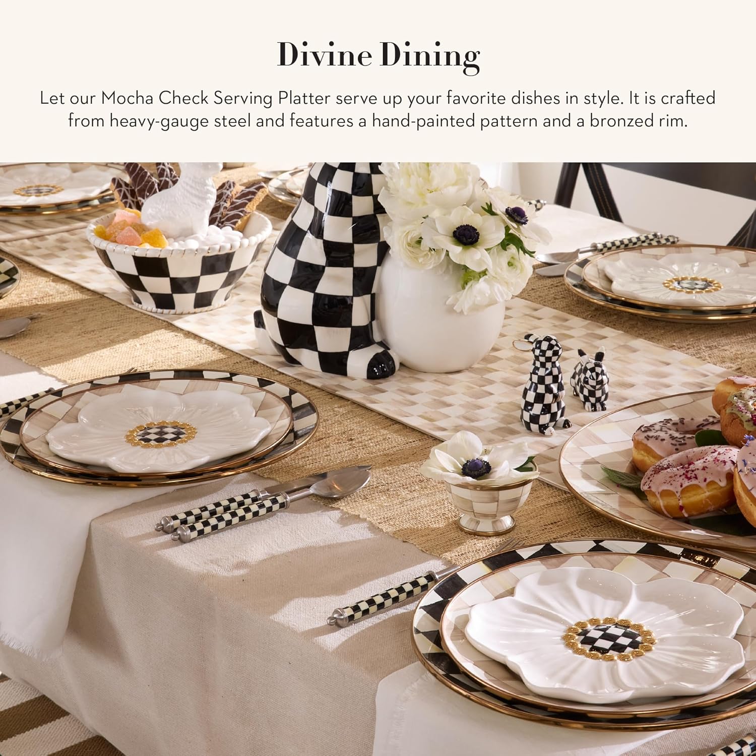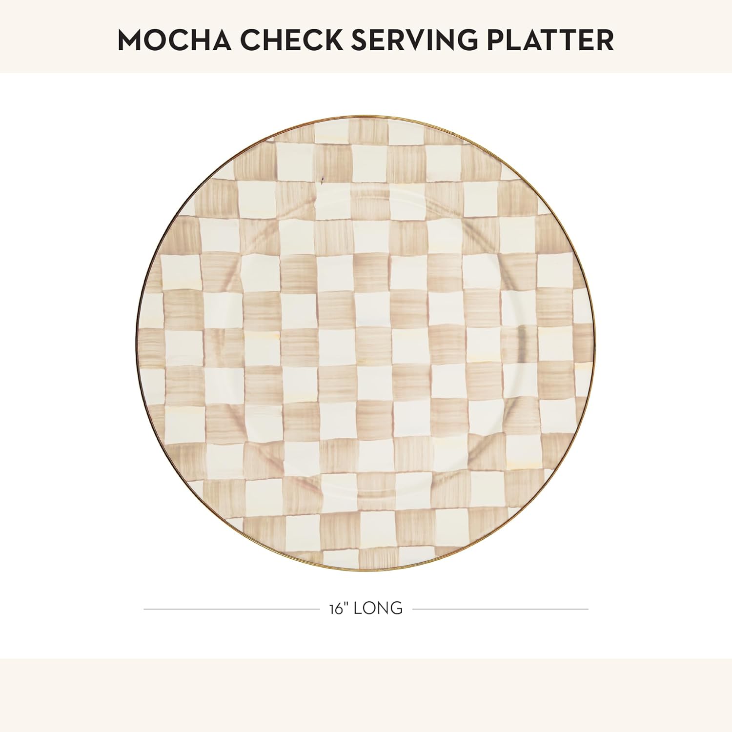 - ENTERTAINING ESSENTIAL: Serving dishes for entertaining donโt get any more charming than this. Our Mocha Check food platter features a hand-painted brown-and-white checkered pattern, a heavy-gauge steel underbody, and a bronzed stainless-steel rim.