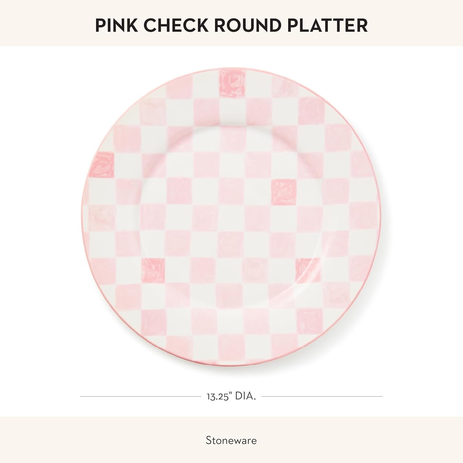 - SERVING ESSENTIAL: Create a fun table with this entrée or dessert platter. The Pink Check round serving plate features hand-applied check transfers in shades of pink and is finished with a hand-painted rim.