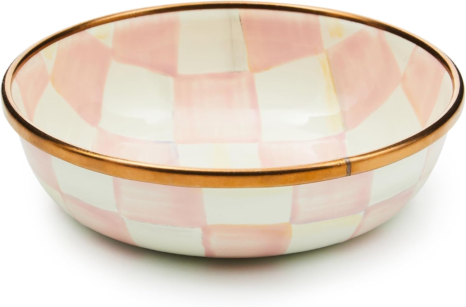 - ENTERTAINING ESSENTIAL: Elevate your serving dishes for every single snack or meal with our Rosy Check small bowl for relish. It features hand-painted, color-dragged pink-and-white checks on enameled steel and has a bronzed stainless-steel rim.