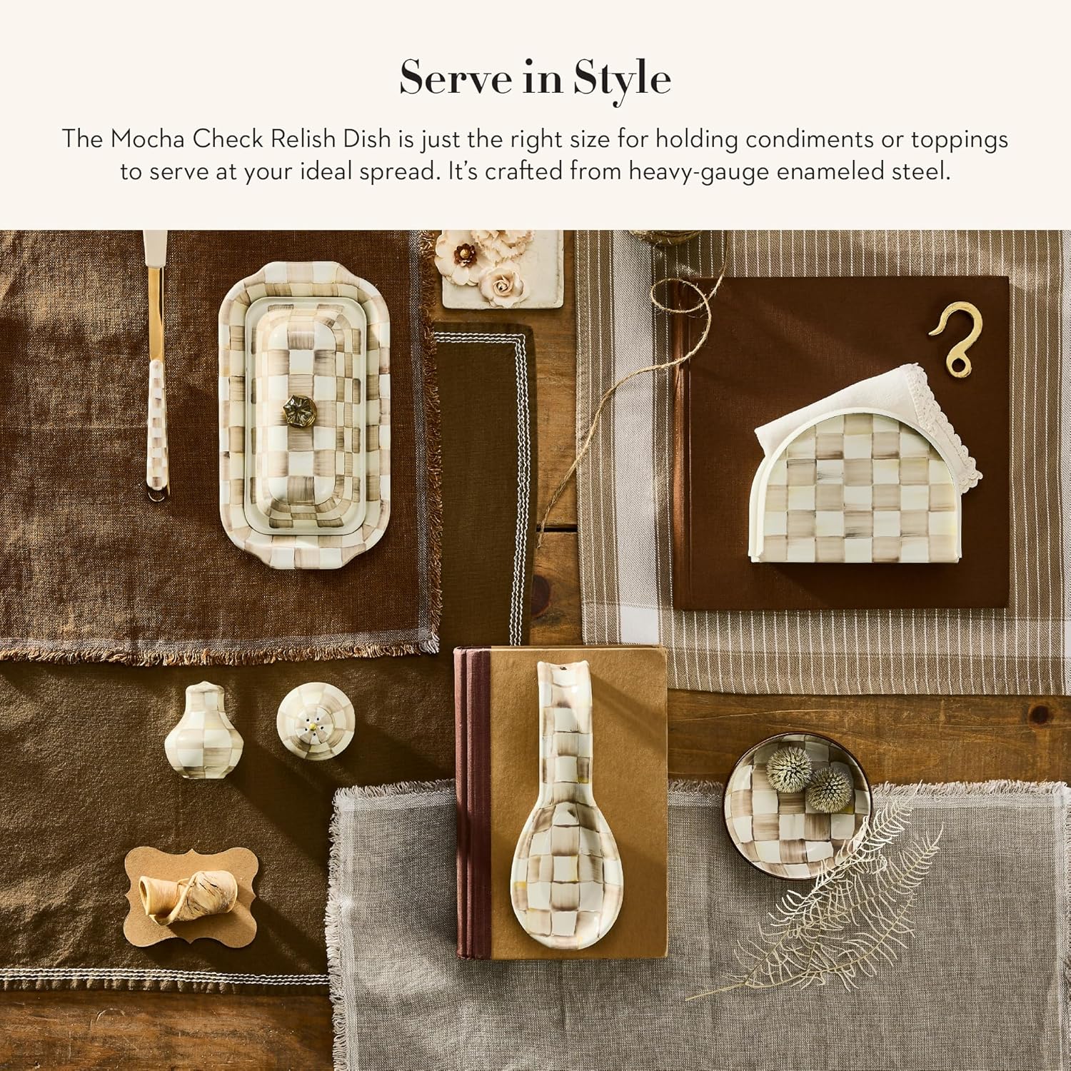 MACKENZIE-CHILDS Enamel Relish Dish, Small Serving Bowl for Entertaining, Brown-and-White Mocha Check