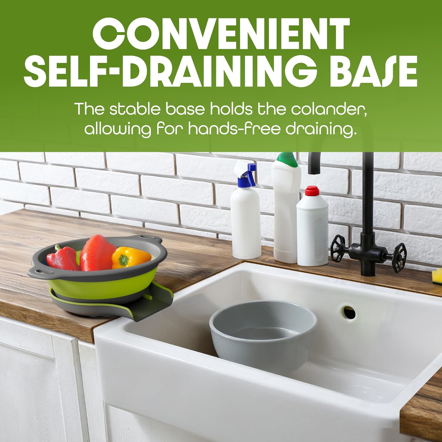 - This collapsible colander features an innovative self-draining base that allows water to drain directly into your sink, even when it's full.