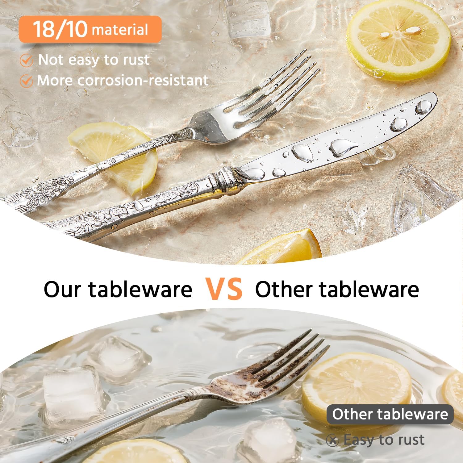 KINGSTONE Vintage Carved Silverware Set, 40-Piece 18/10 Stainless Steel Flatware Cutlery Set with Retro Royal Thick Handle, Tableware Utensils for Home, Restaurant, party, Wedding, Dishwasher Safe