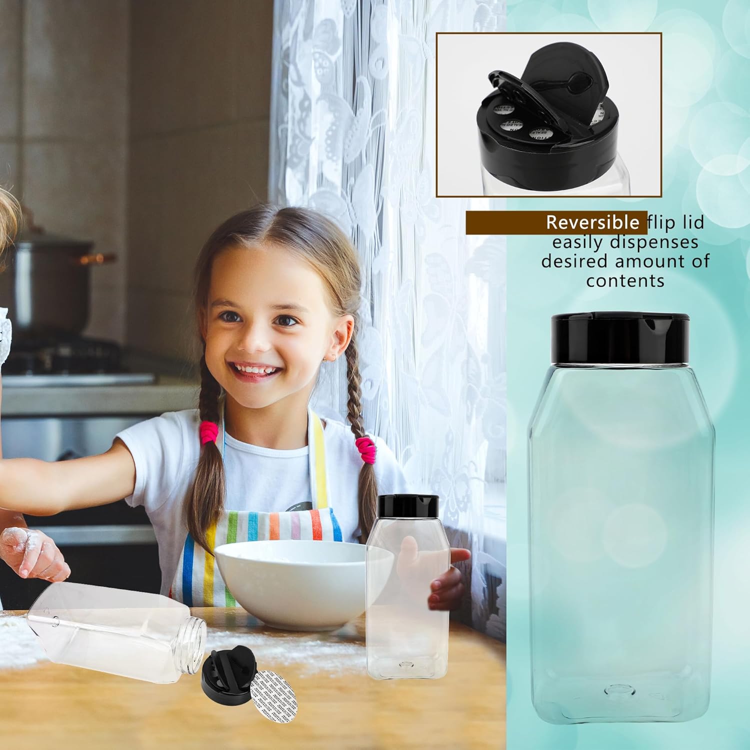 - 【Quality Material】: The clear spice jars with shaker lids are made of quality PET plastic material, lightweight and sturdy, reliable and strong, washable and reusable, not easy to break or deform, offering you long serving time