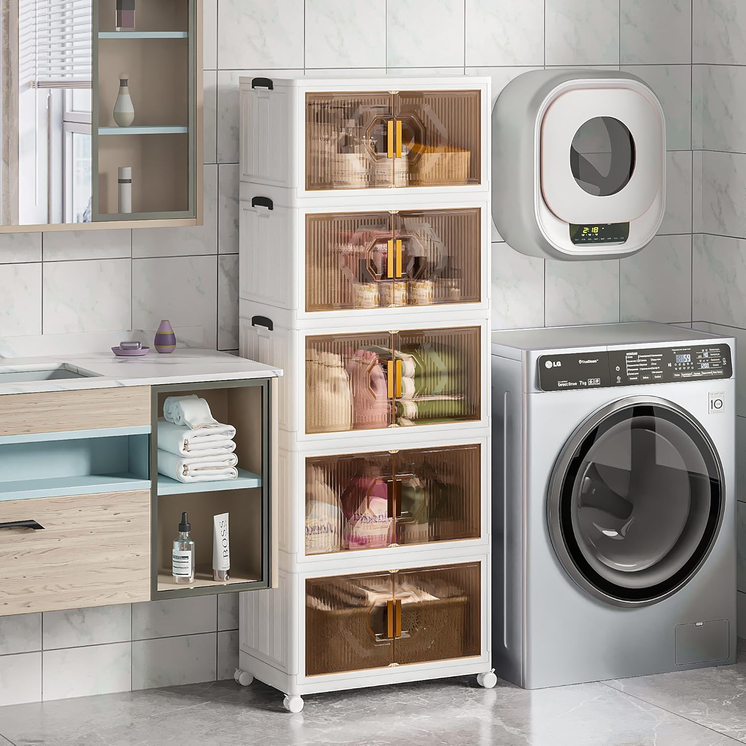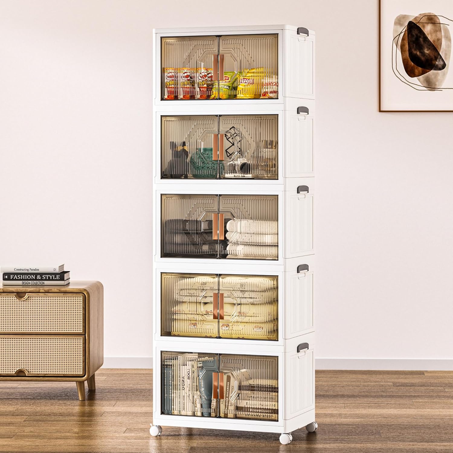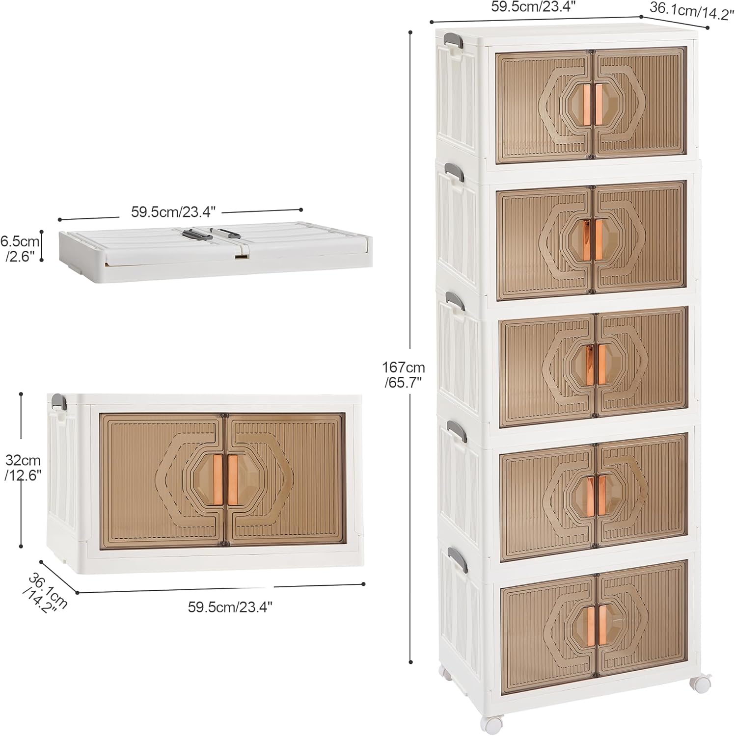 VECELO 19 Gal Stackable Storage Bins with Lid, 5 Pack Plastic Collapsible Storage Cabinet, Foldable Folding Box Organizer/Storage Container Cart with Wheel and Double Door for Home Office, White