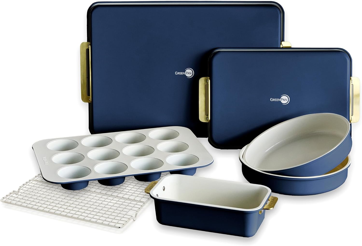 GreenPan Bakeware Set, 7 Piece Nonstick Ceramic Gold Handle Baking Sheets, Cake Pans, Loaf Pan, Muffin Tin, Cooling Rack, PFAS & BPA Free, Freezer to Oven Dish, Bake & Roast Ovenware, Oxford Blue