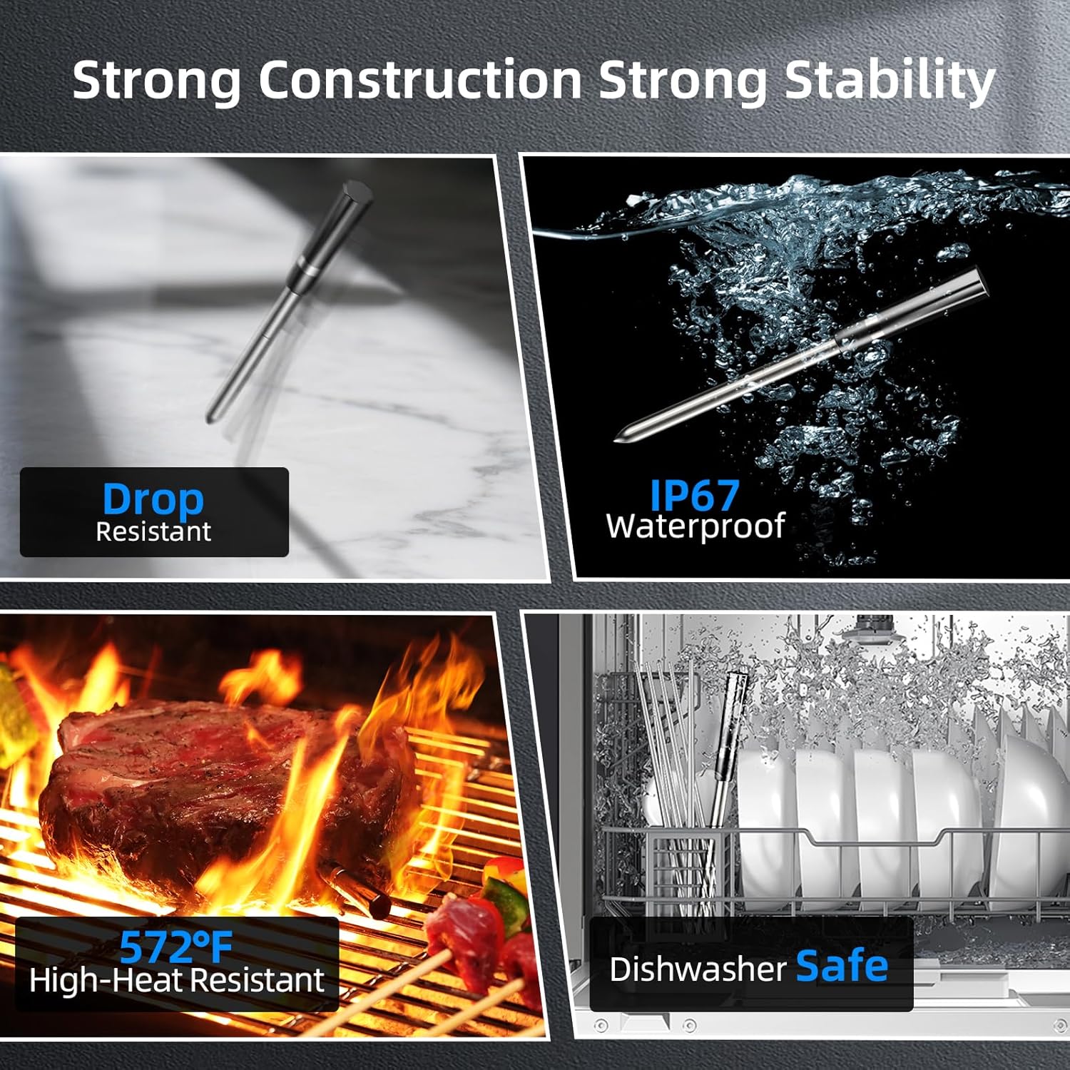 - ăDual-Sensor Precision & Durable Food-Grade DesignăThe Aurasky wireless meat thermometer features dual sensors and a high-temperature safety line, delivering precise temperature readings to prevent overcooked or undercooked meals. Built to last, it boasts an IP67 waterproof rating and exceptional thermal shock resistance, making it ideal for grilling, frying, and other high-heat cooking methods. Crafted with a ceramic handle and an FDA 316 stainless steel probe, this cooking thermometer is made from food-grade materials, ensuring both safety and durability for all your culinary adventures