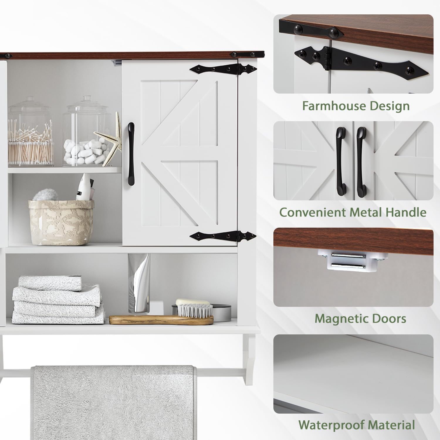 - 【FARMHOUSE RUSTIC STYLE】Crafted from sturdy engineered wood with a distressed natural wood grain top, this cabinet enhances your home with a charming farmhouse aesthetic. The magnetic double doors with metal handles ensure smooth and effortless opening.