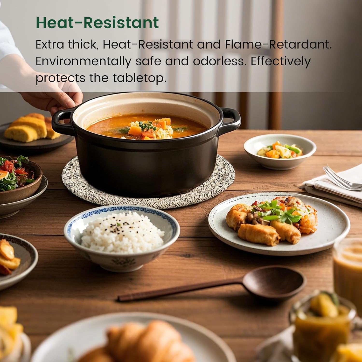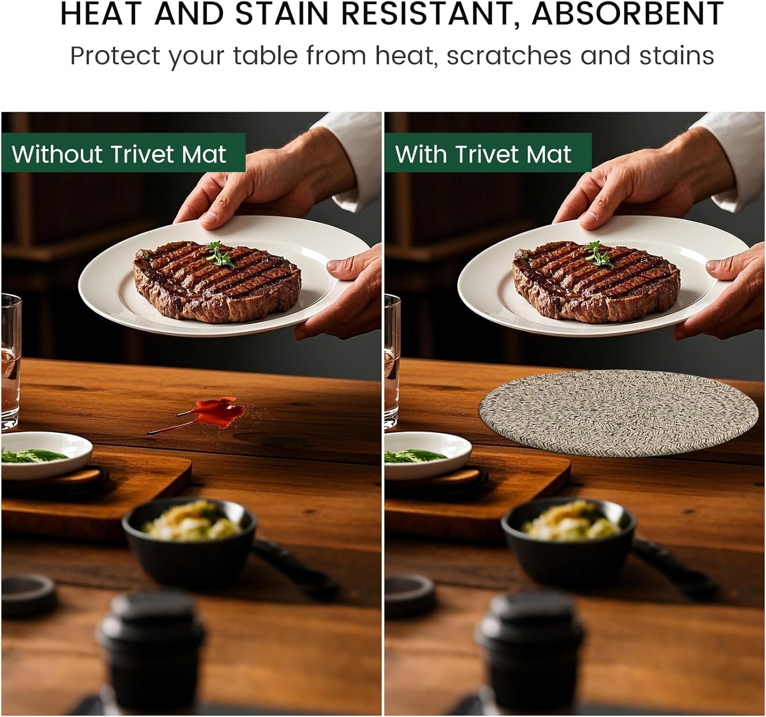 - Super Absorbent & Easy to Clean: These thick woven cotton trivets have better heat absorption, liquid absorption and better protection of the wood surface from water rings, stains and potential damage. Support both machine wash and hand wash, keeping your pad set fresh and ready for reuse