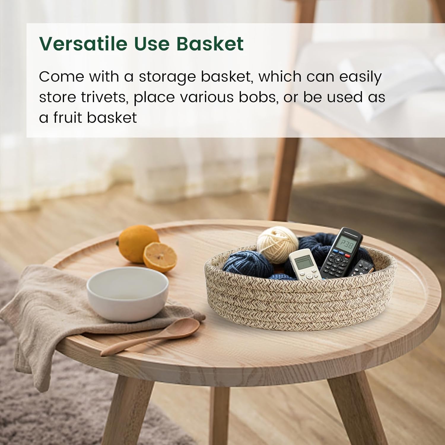 - Trivets Set: Our trivet set includes 4 hot dish trivets in different colors, 7 inches in diameter and 0.32 inches thick. Comes with 7.6 inches diameter storage basket, great for storing those pot holders. Also great used as hold keys, remote controls, pens, stationary, supplies, etc. or be used as a fruit basket