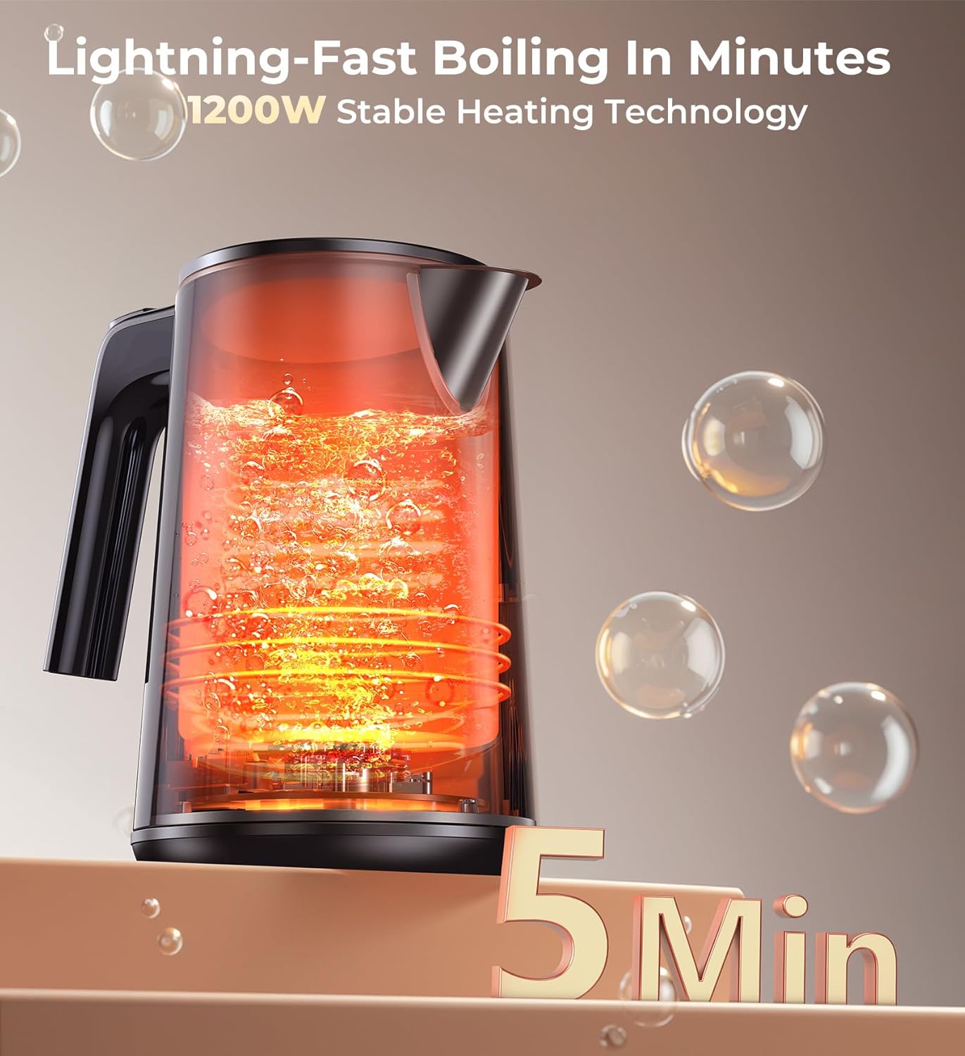 - 【Stay Warm, Stay Safe】This electric tea kettle’s 4-hour keep-warm function means your water stays ready for refills or second cups. The stainless steel interior ensures durability, while the PP outer layer and cool-touch surface prevent burns, making this tea kettle safe to use