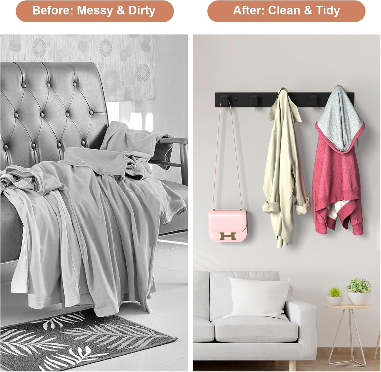 - L-shaped hook design: The L-shaped wall hanging clothes hook has an L-shaped shape, which can store clothes well, helping to store and organize, while forming a beautiful scenery line